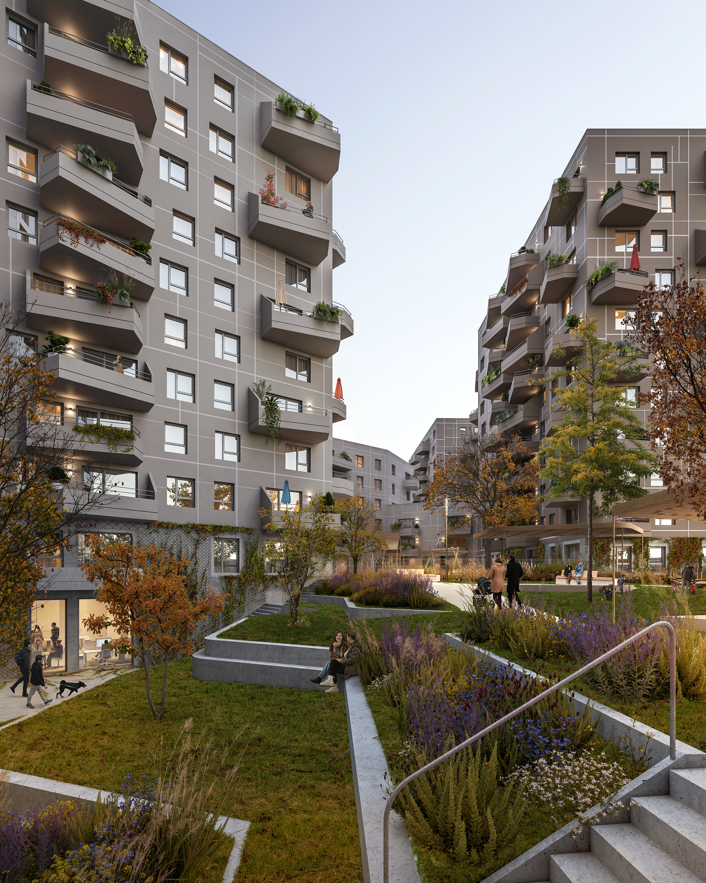 - Ein Sockelgarten mit hoher Grünqualität bietet großzügige Verweil- und Aufenthaltsflächen.