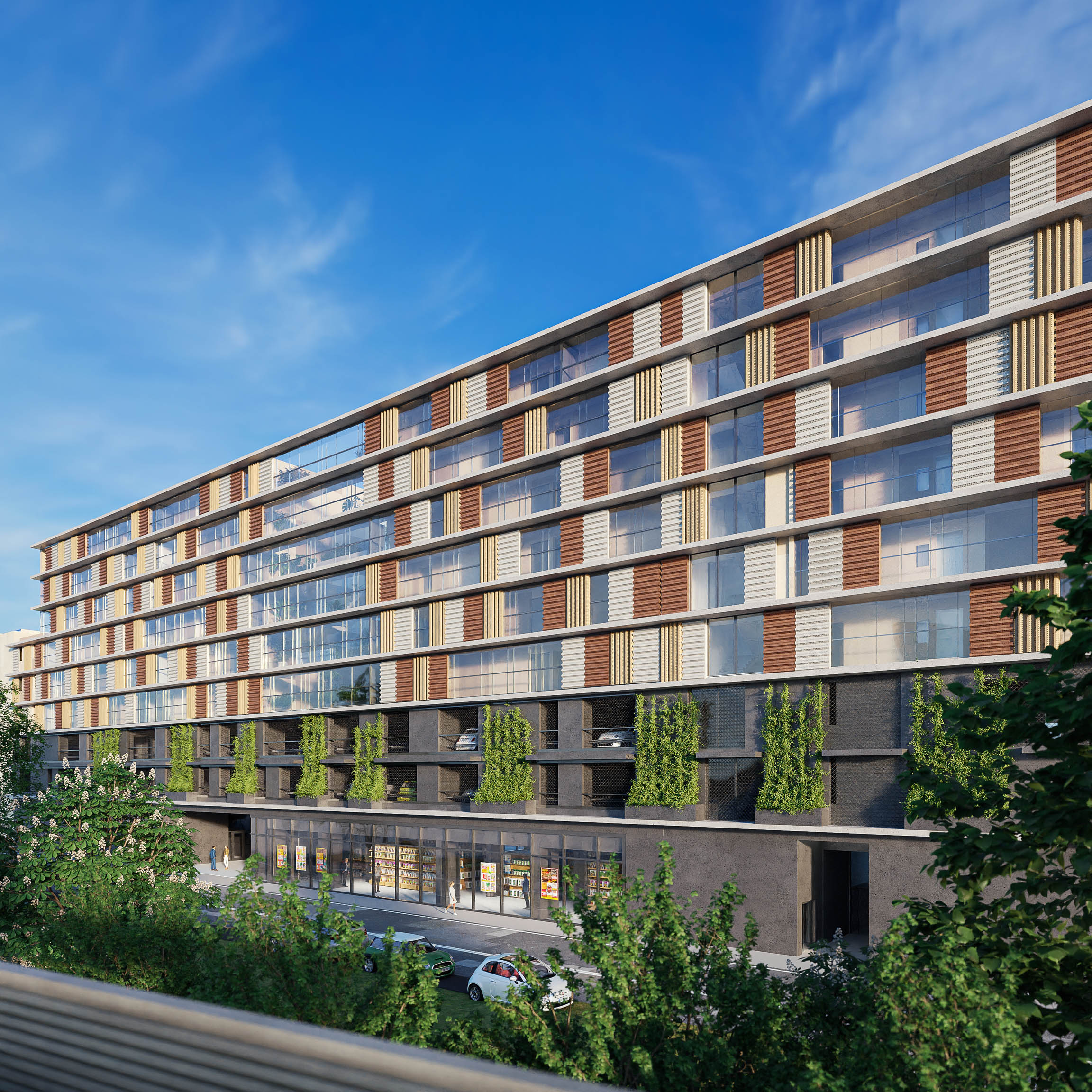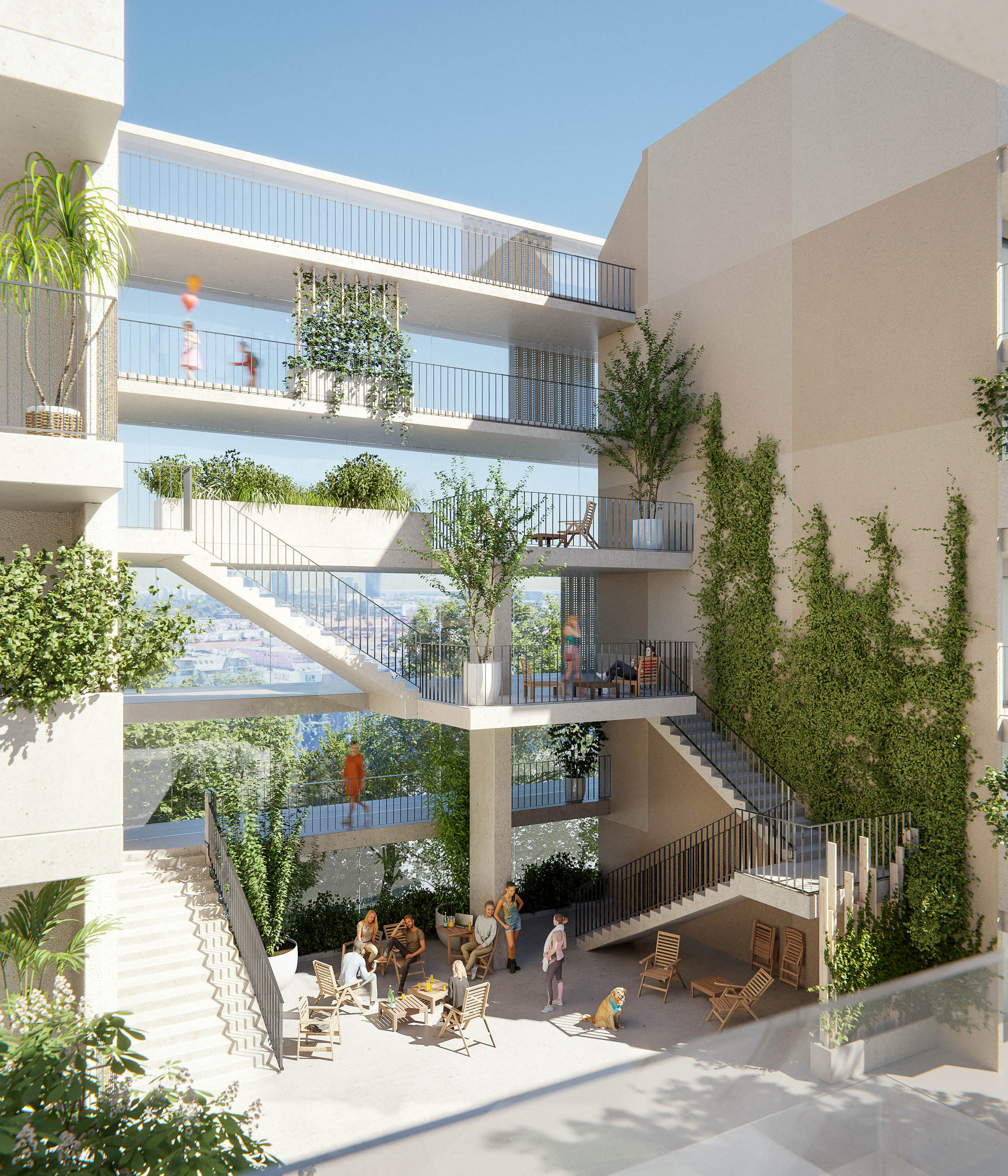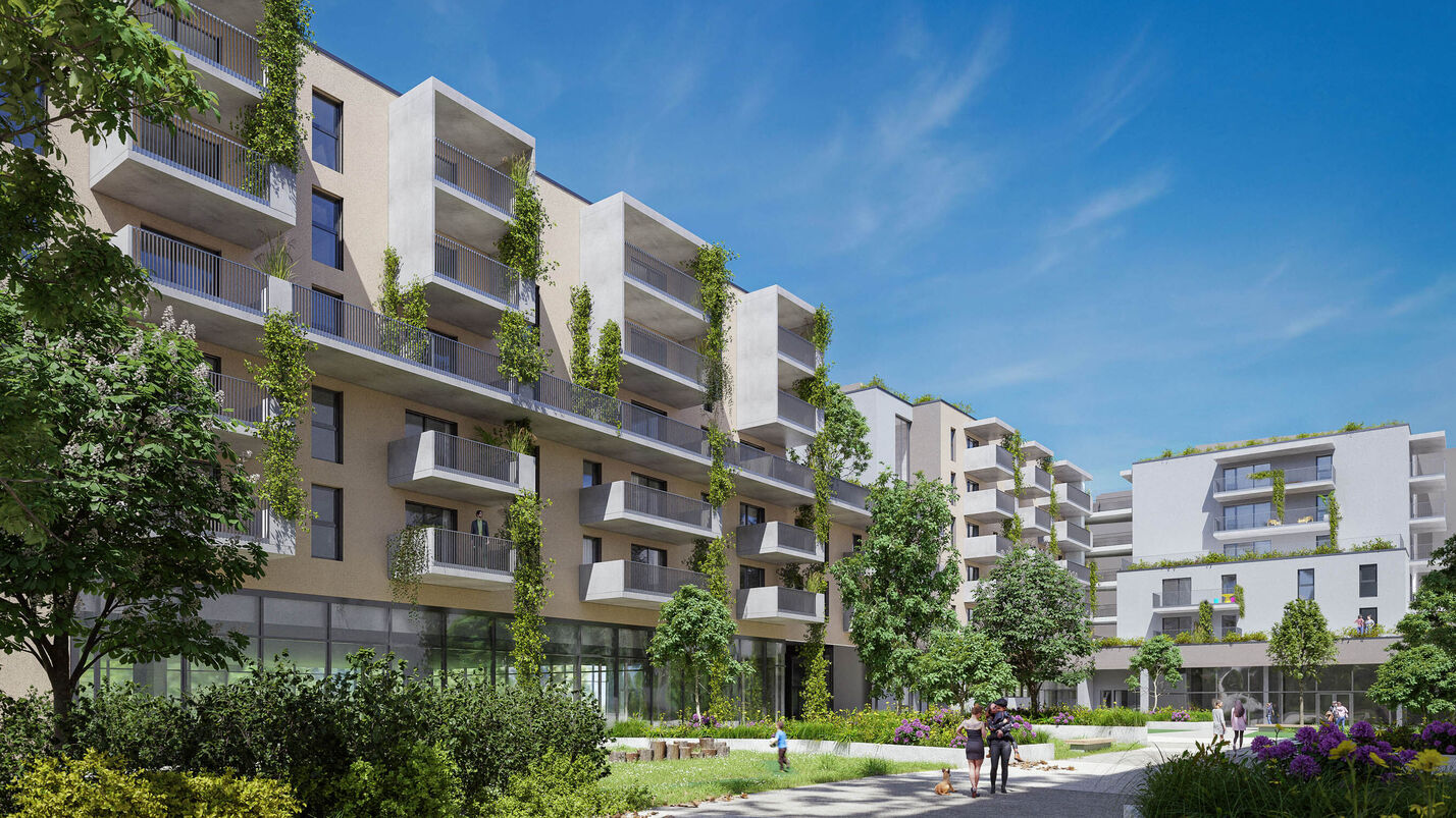 Das Projekt verfolgt ein nachhaltiges Konzept, das sowohl ökologische als auch soziale Aspekte berücksichtigt. Begrünte Dachflächen mit integrierten Pergola-Konstruktionen schaffen attraktive Aufenthaltsbereiche, die nicht nur Raum für Urban Gardening bieten, sondern auch als Treffpunkte für verschiedene Generationen dienen. So entstehen gemeinschaftliche Orte der Begegnung und des Austauschs. Zur regenerativen Stromerzeugung wird eine Photovoltaikanlage eingesetzt. Die Wärmeversorgung des Gebäudes erfolgt über eine Kombination aus Wärmepumpen mit Geothermie (Tiefensonden) und einem zusätzlichen Fernwärmeanschluss. Für eine klimaneutrale Kühlung in den Sommermonaten sorgt die Bauteilaktivierung. Ergänzt wird das Konzept durch Fassadenbegrünungen und ein intelligentes Regenwassermanagement.