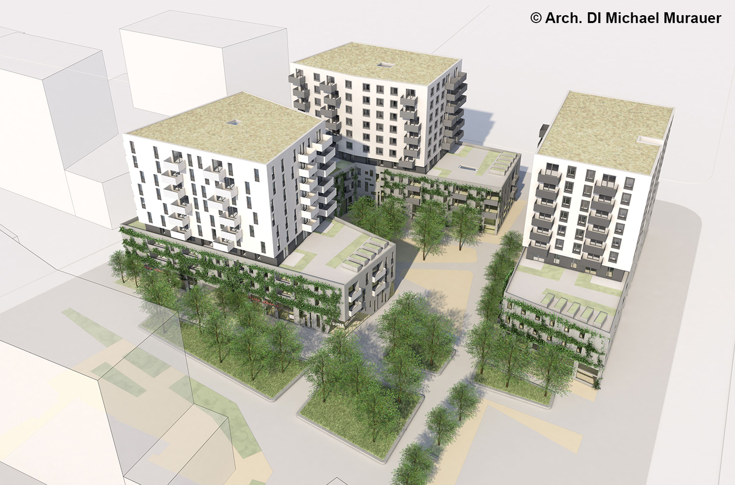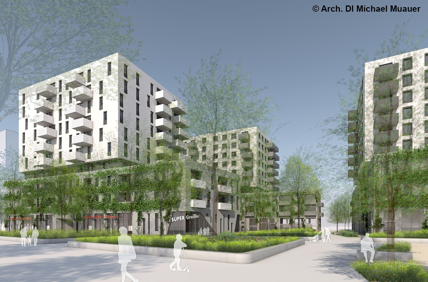 Auf dem Bauplatz sind elf Geschäftsflächen, u.a. Arztpraxen und eine Apotheke, geplant. Möglich sind auch „Raumteiler“ für Ein-Personen-Unternehmen und Kleingewerbe. Ein „Supergreißler“ soll als Seele des Quartiers eingesetzt werden – als Hausbetreuer*in, Ansprechpartner*in für Raumteiler, Nachbarschaftsbetreuung sowie vielfältige Angebote von alltagserleichternden Dienstleistungen. Darüber hinaus soll es sogenannte Wohncluster für Senior*innen und Alleinerziehende geben – ein Mix aus Wohngemeinschaft und Kleinwohnung.