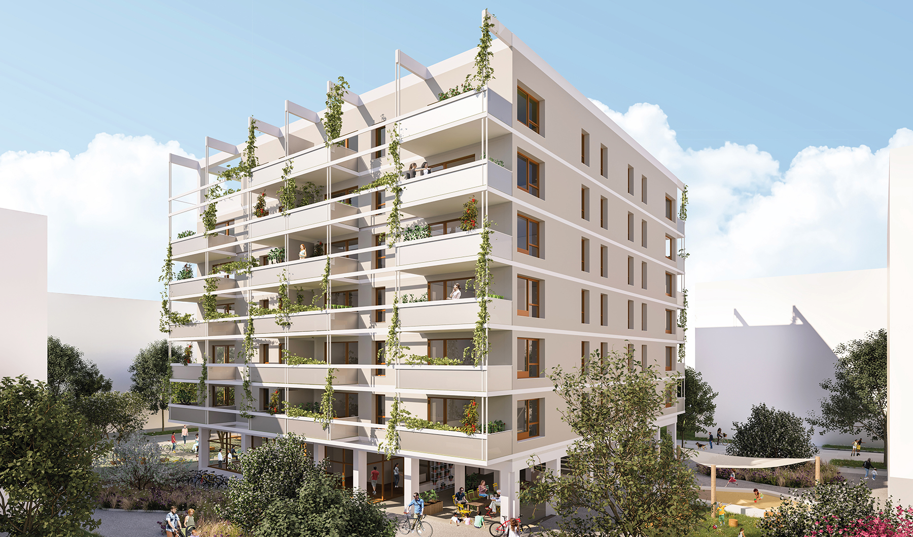 - Erdgeschoßzone mit Grätzlplatz und begrüntem Innenhof