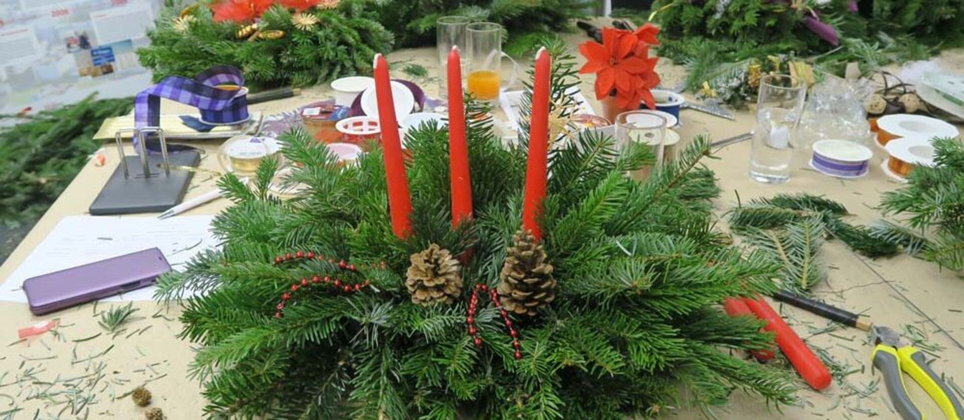Besucher*innen haben die Möglichkeit, gemeinsam Adventkränze zu binden sowie winterliche Dekoration für ihr Zuhause zu basteln und kreativ zu gestalten.