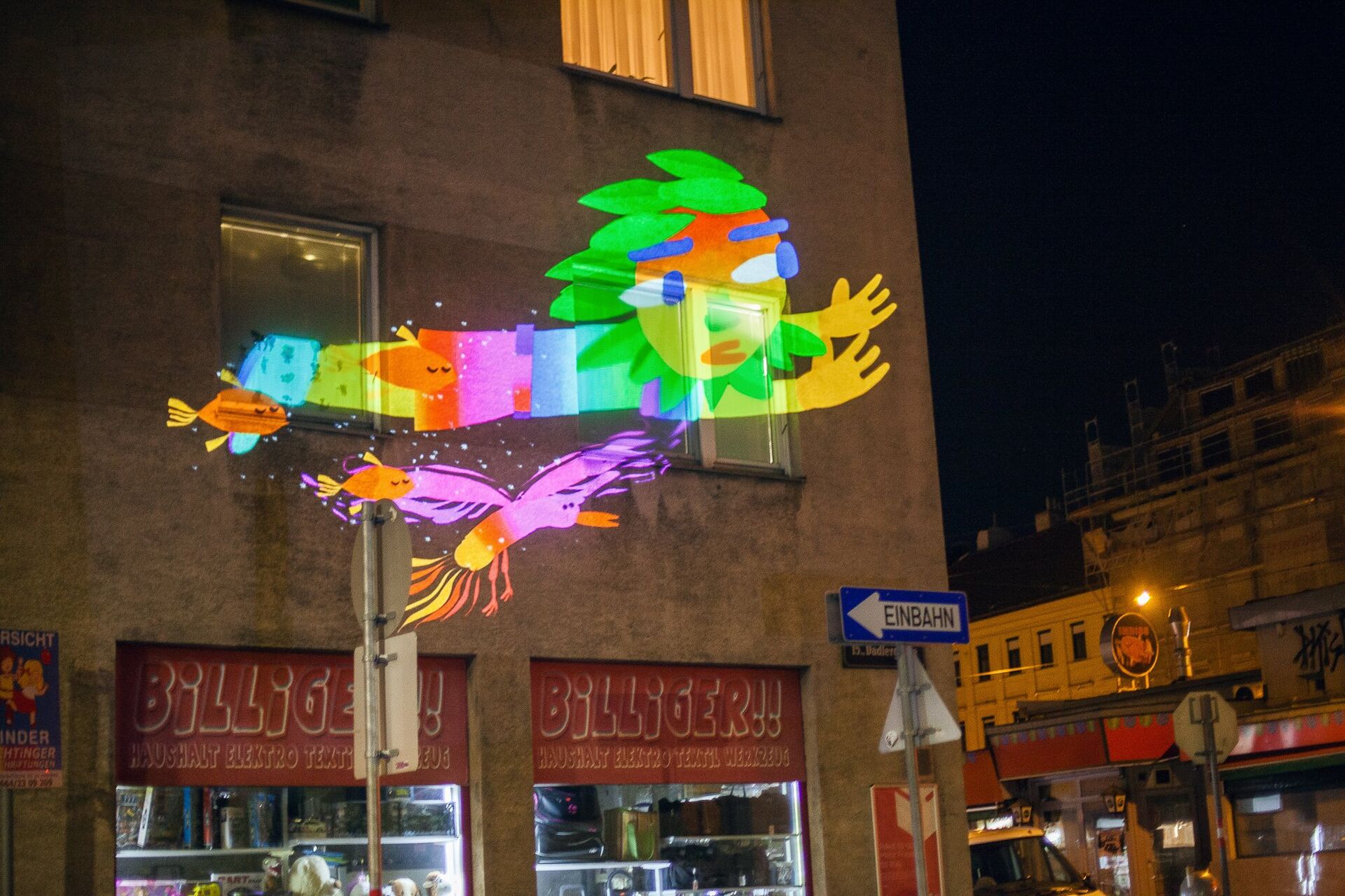 Gezeigt wurden Fassaden-Projektionen, bei denen die Bewohner*innen auf einfache Weise mittels App auf einem Tablet in Echtzeit mitwirken konnten. Das Team von OMAI war dafür im Oktober mit einem Rad in der Wohnhausanlage unterwegs und projizierte mittels mobilem Beamer und der Software „Tagtool“ kreative Beiträge von Bewohner*innen an die Hausfassaden.