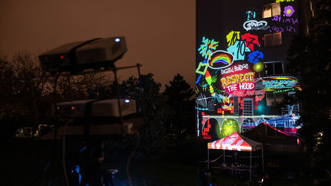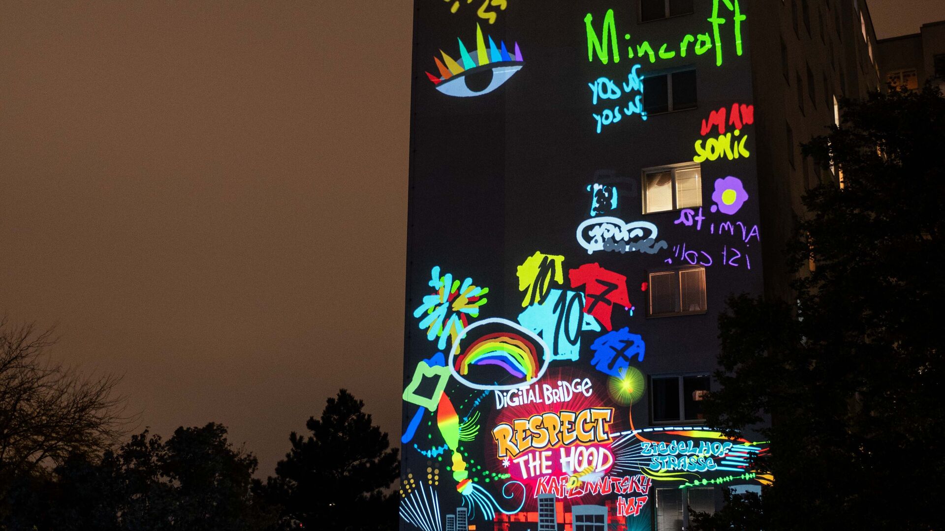 Die Projektionsmaler von der Künstlergruppe OMAi ziehen mit ihrem “Tagtool Bike” an mehreren Abenden durch den Gemeindebau, um gemeinsam mit den Bewohner*innen die Fassaden zu gestalten. Durch diese kreative Zusammenarbeit sehen die Bewohner*innen ihre gewohnte Umgebung sprichwörtlich in einem neuen Licht!