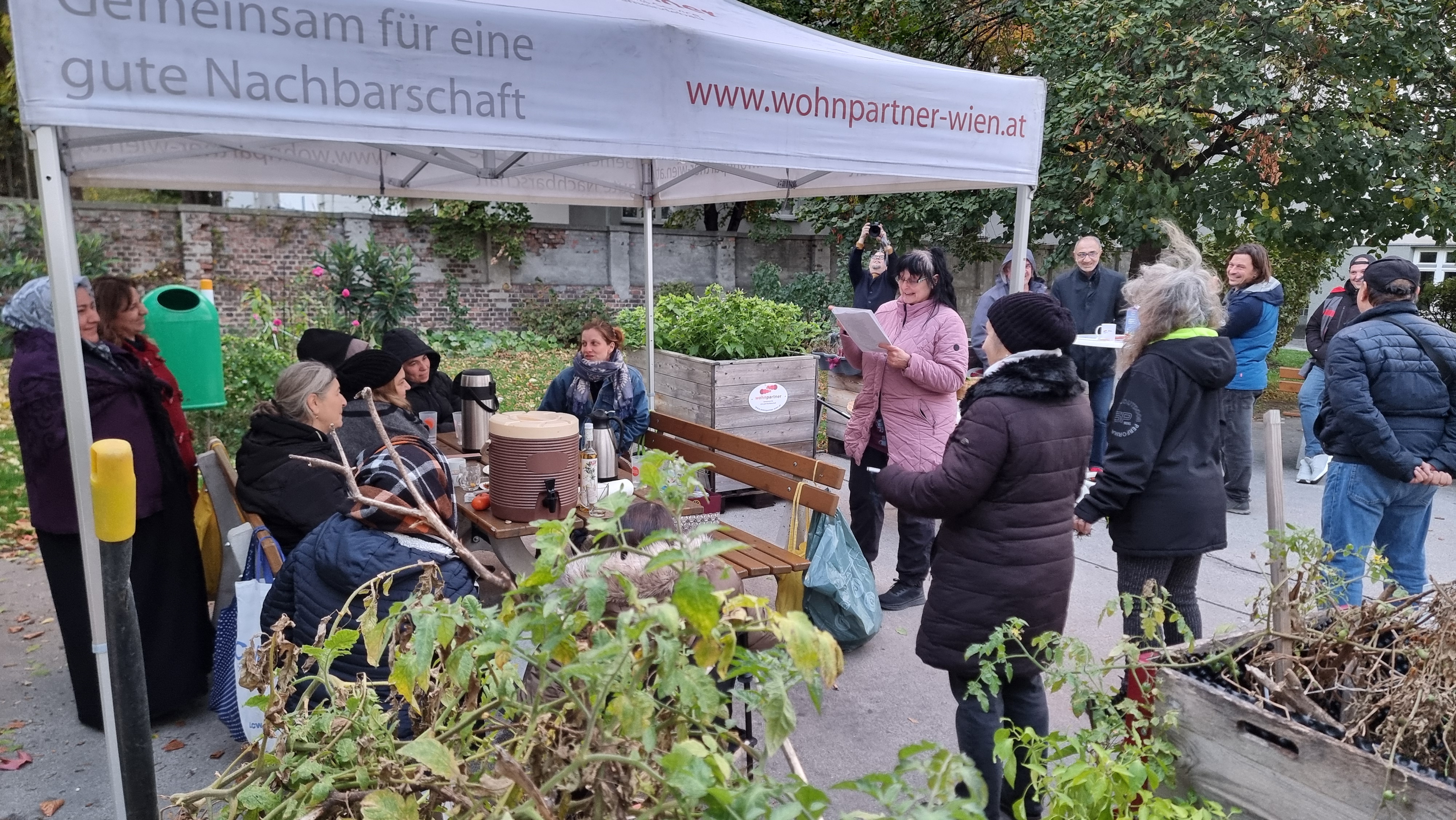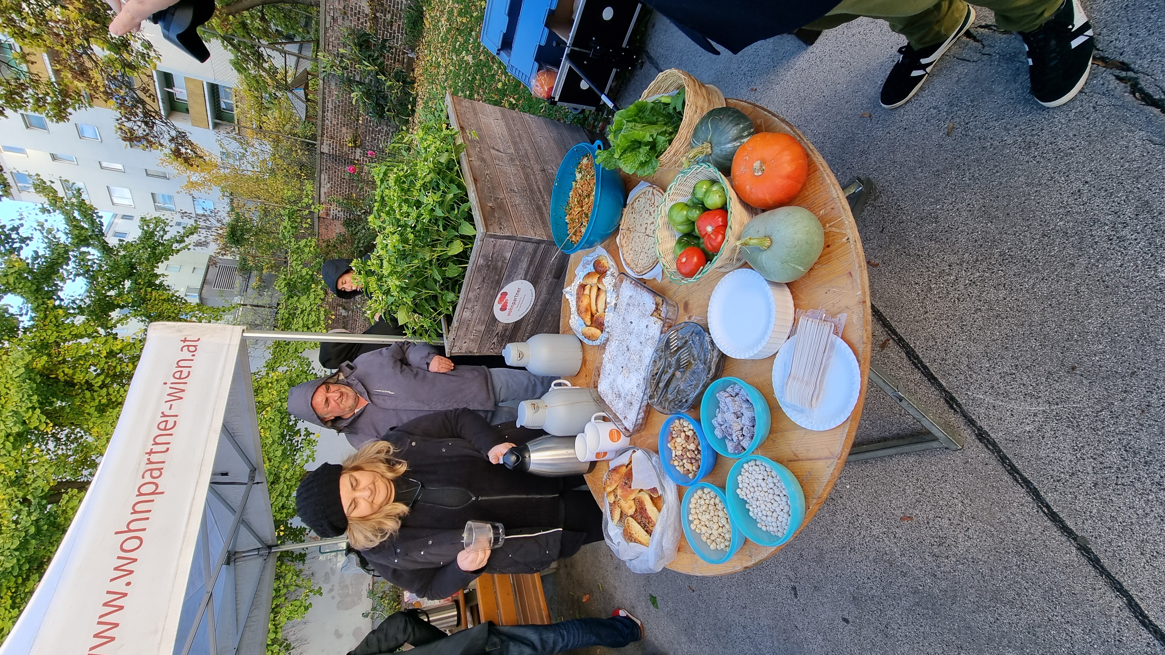 Am 24. Oktober 2025 fand im Gerlhof das diesjährige Erntedankfest statt. Bei guter Stimmung folgten rund dreißig Mieter*innen der Einladung von wohnpartner und der Hochbeet-Gärtner*innen, wobei letztere ein buntes Buffet zusammenstellten. Alle kamen miteinander ins Gespräch und auch die beiden Grätzl-Polizist*innen tauschten sich rege mit den Teilnehmenden aus.