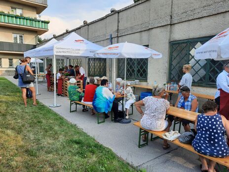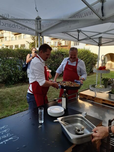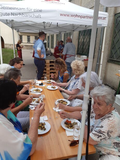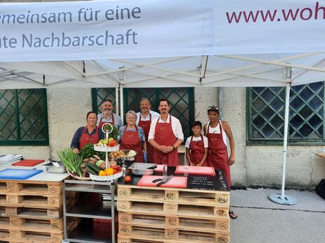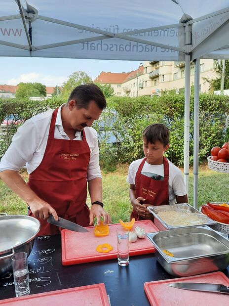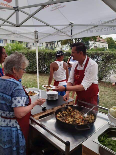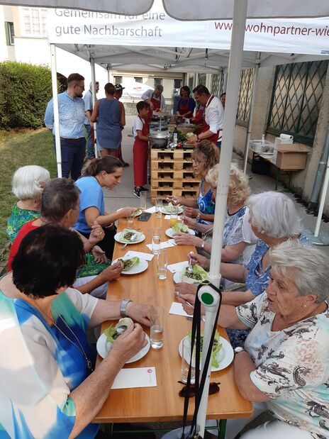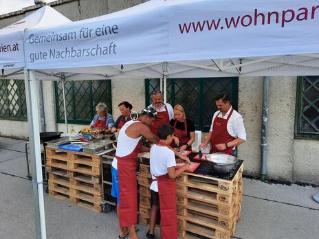 Am Dienstag, dem 11. August kochte der Favoritner Bezirksvorsteher Marcus Franz im Rahmen von „Wasch und Tratsch“ mit und für 30 BewohnerInnen des George- Washington-Hofes.
