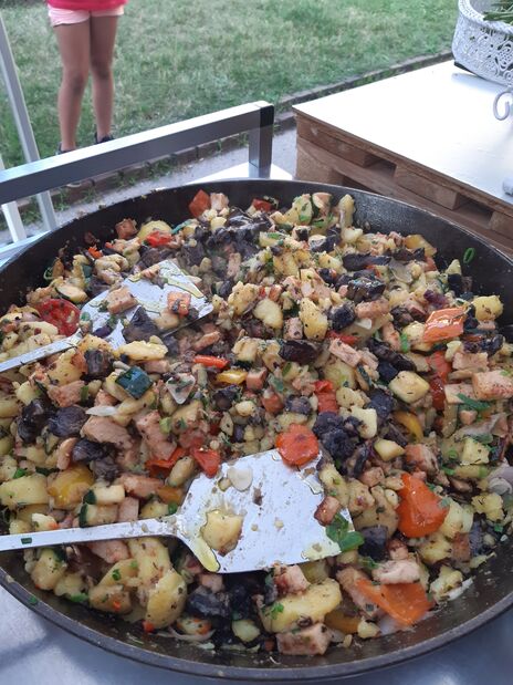 Nach einem schnell hergerichteten Tabouleh-Salat konnten die BesucherInnen die Hauptspeise – ein veganes Gröstl – kaum erwarten. Nette Stimmung – lächelnde Gesichter – voller Magen - genau das richtige für einen heißen Nachmittag im George-Washington-Hof.