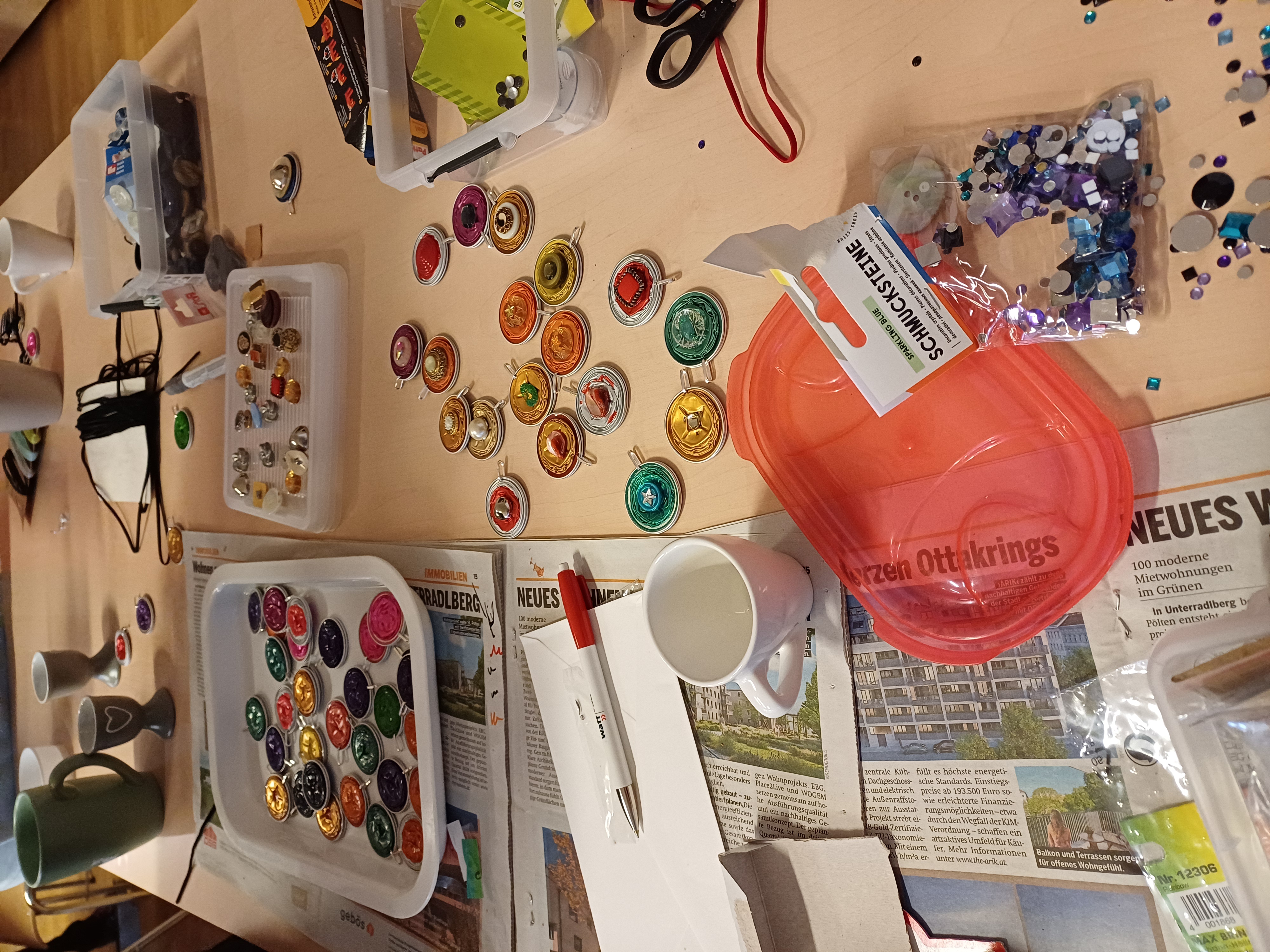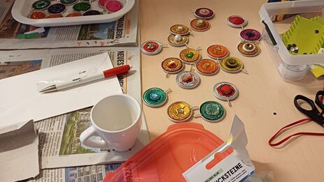 Es gab zwei Bastelstationen: An einer Station wurden Halsketten aus Kaffeekapseln und Knöpfen gestaltet. Diese Schmuckstation wurde von einer Teilnehmerin des Frauencafés betreut. Bei der anderen Station wurden große und kleine Porzellantassen weihnachtlich bemalt.