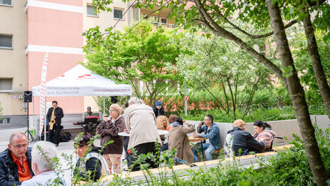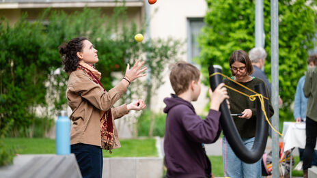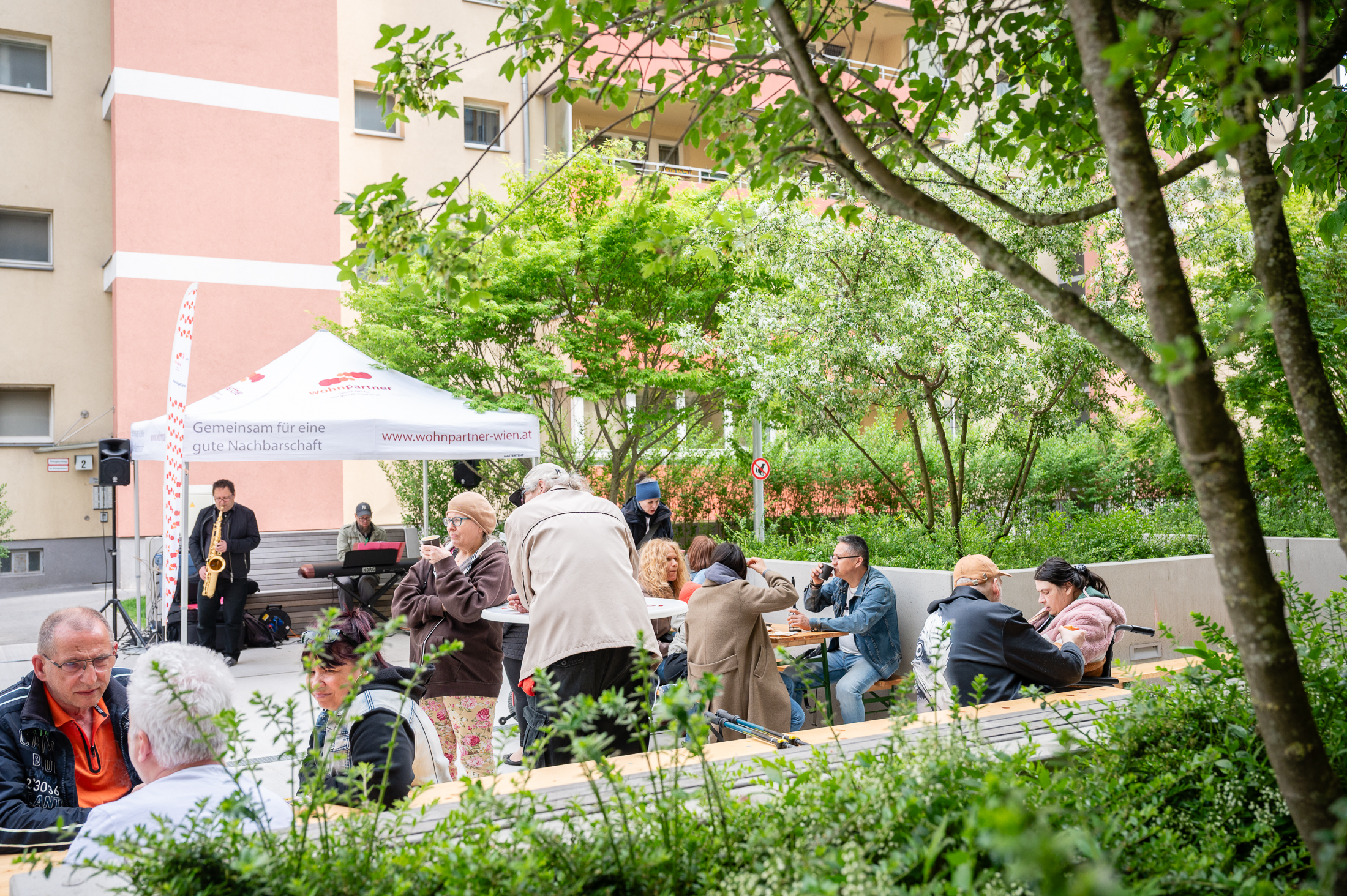Zum Abschluss der Einzugsbegleitung des WIGEBA-Baus in der Dr.-Natterer-Gasse 4A wurde ein Frühjahrsfest mit Buffet, Coffee-Bike, musikalischer Begleitung, Kinderbetreuung durch die Zirkuswerkstatt und Info-Ständen von Grätzlpolizei, Frühe Hilfen und wohnpartner veranstaltet. Viele Mieter*innen nutzten die Möglichkeit, um mit Expert*innen und Nachbar*innen ins Gespräch zu kommen.