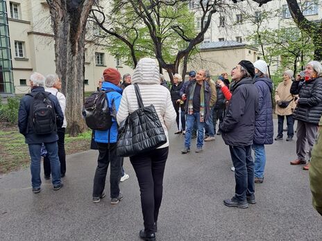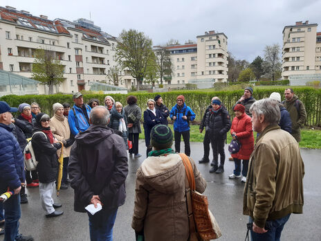 Trotz regnerischem Aprilwetter kamen 30 Interessent*innen zur Führung des Kulturhistorikers Professor Dr. Ernst Strouhal von der Universität für angewandte Kunst. Ernst Strouhal legte dabei besonderes Augenmerk auf die architektonischen Besonderheiten: die Einflüsse der Otto Wagner-Schüler, die hier am Werk waren, sowie Elemente des Bauhausstils, die sich in der Wohnhausanlage vielfältig kombiniert wiederfinden.