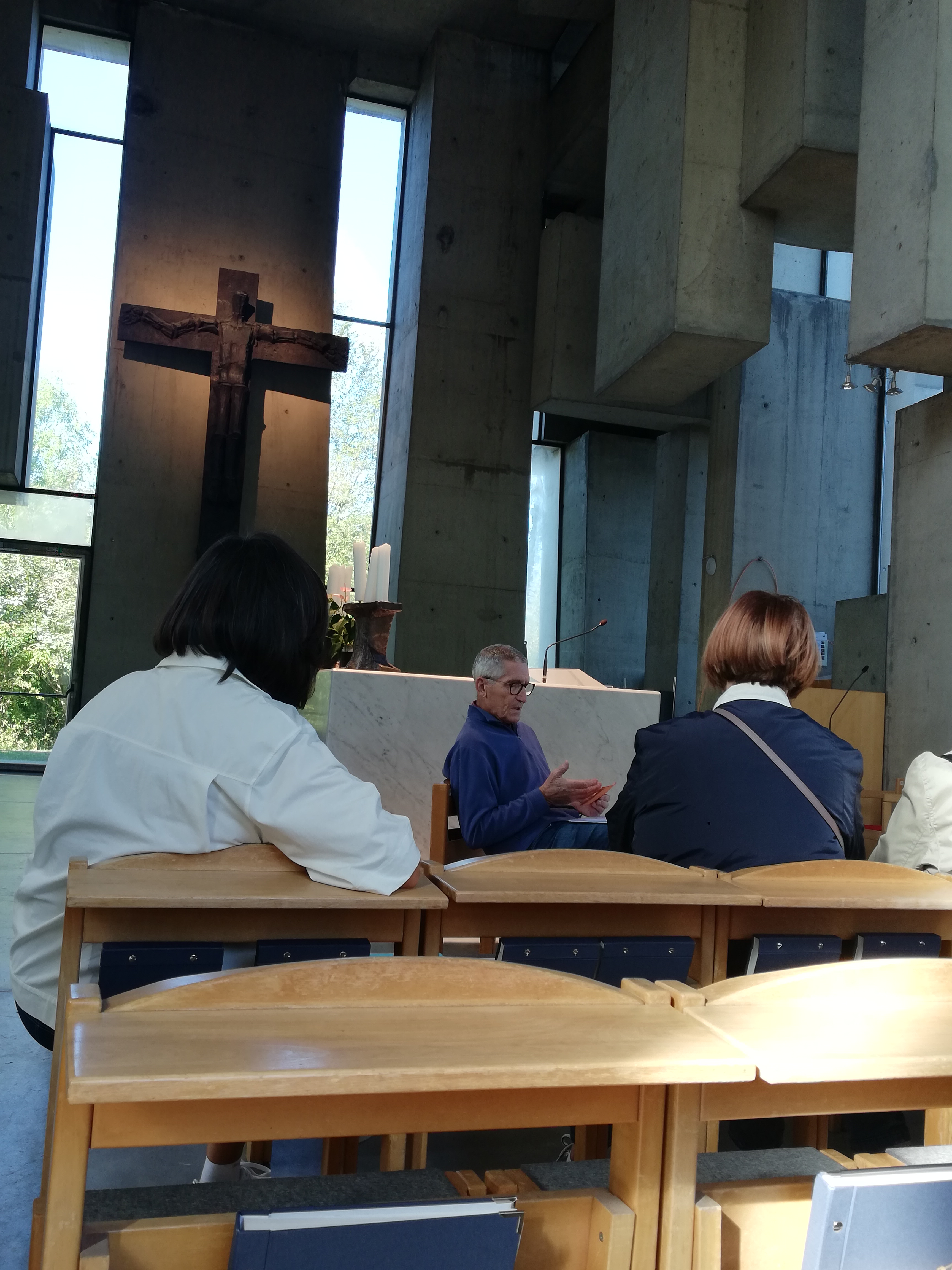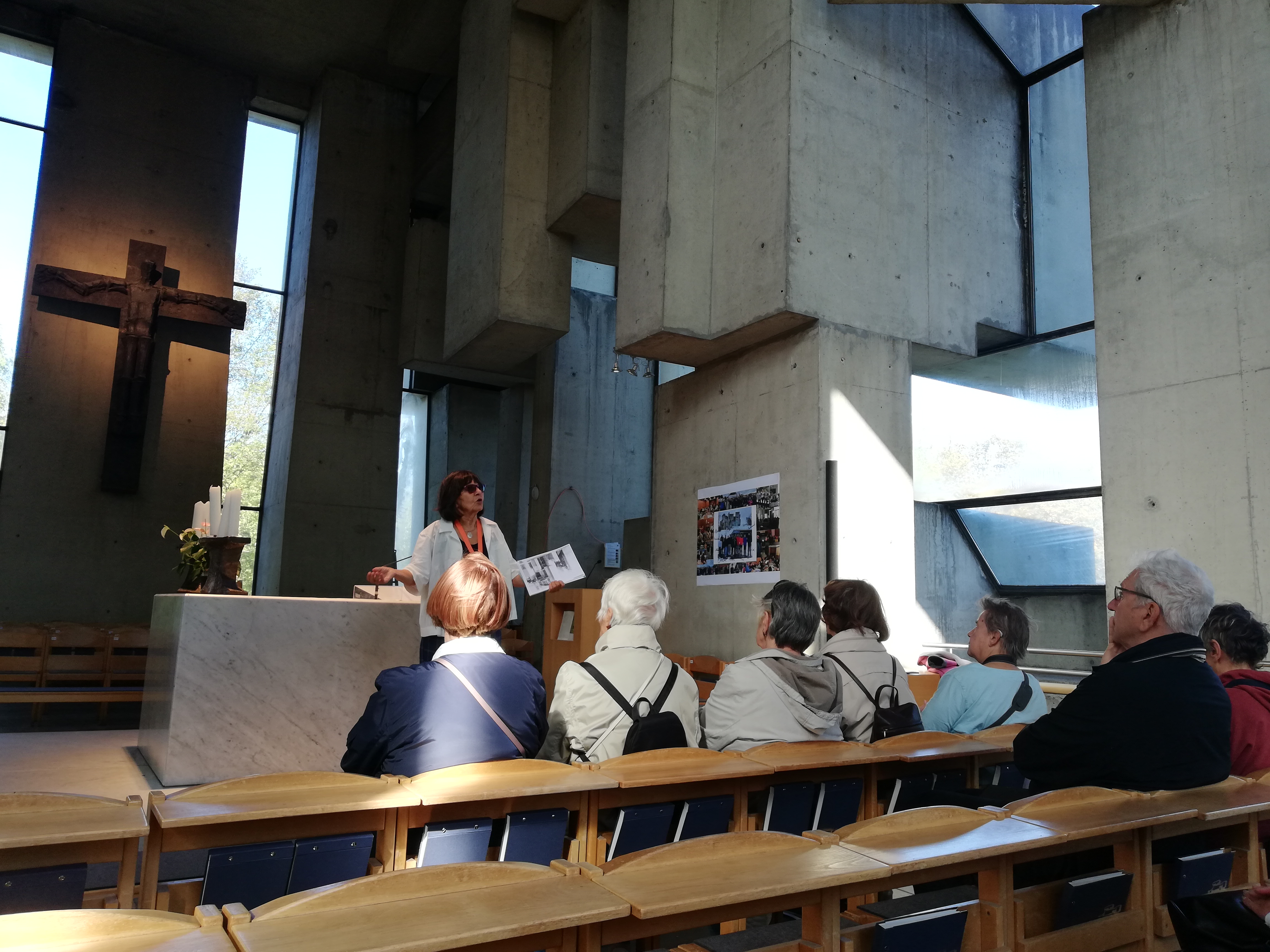 Anschaulich wurden die Entstehungsgeschichte sowie die architektonischen Besonderheiten der Kirche vorgestellt. Einige Fragen warfen zum Beispiel die Statik und das Material (Sichtbeton) der im brutalistischen Stil erbauten Kirche auf, die explizit zum Diskutieren anregen soll. So wollte es die Managerin Margarethe Ottillinger, die den Bau der Kirche anregte und förderte, nachdem sie 1955 nach schuldloser Gefangenschaft in der Sowjetunion nach Österreich zurückkehrte. Über ihr vehementes Engagement, ihre zielstrebige Karriere und den Skandal um ihre unrechtmäßige Festnahme und Gefangenschaft berichtete einer der Teilnehmer der Gruppe nach vorheriger Recherche – ganz nach dem Motto der Grätzl-Entdeckungen „informativ und partizipativ“.