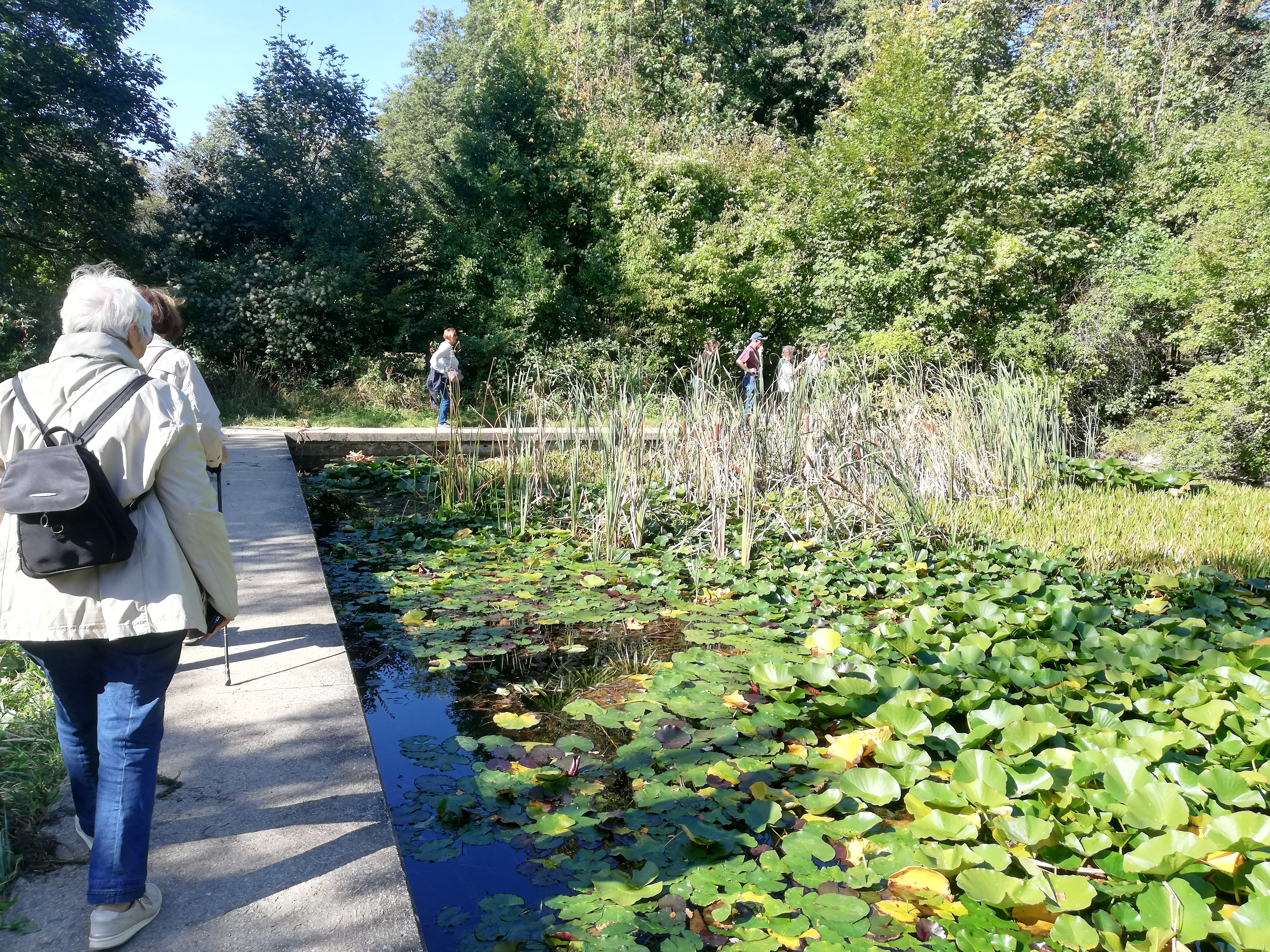 Danach ging die Gruppe weiter ins Grüne, in den Maurer Wald, zum „Sterngarten“ und seinem Freiluftplanetarium, dem einige wohl noch einmal nach Sonnenuntergang einen Besuch abstatten werden. Von dort aus ging es zum Pappelteich, der eine grüne Schilf- und Seerosenoase für Frösche und Libellen bietet, welche die Teilnehmenden mit Freude beobachteten und fotografierten.
