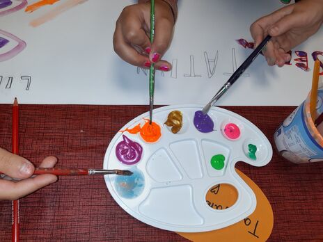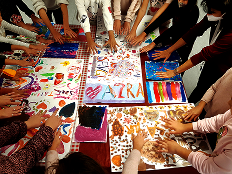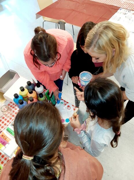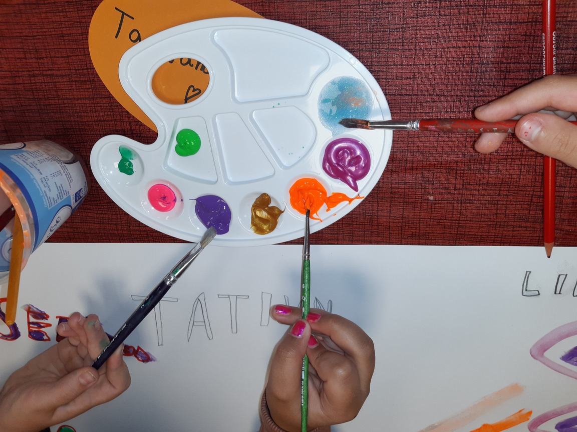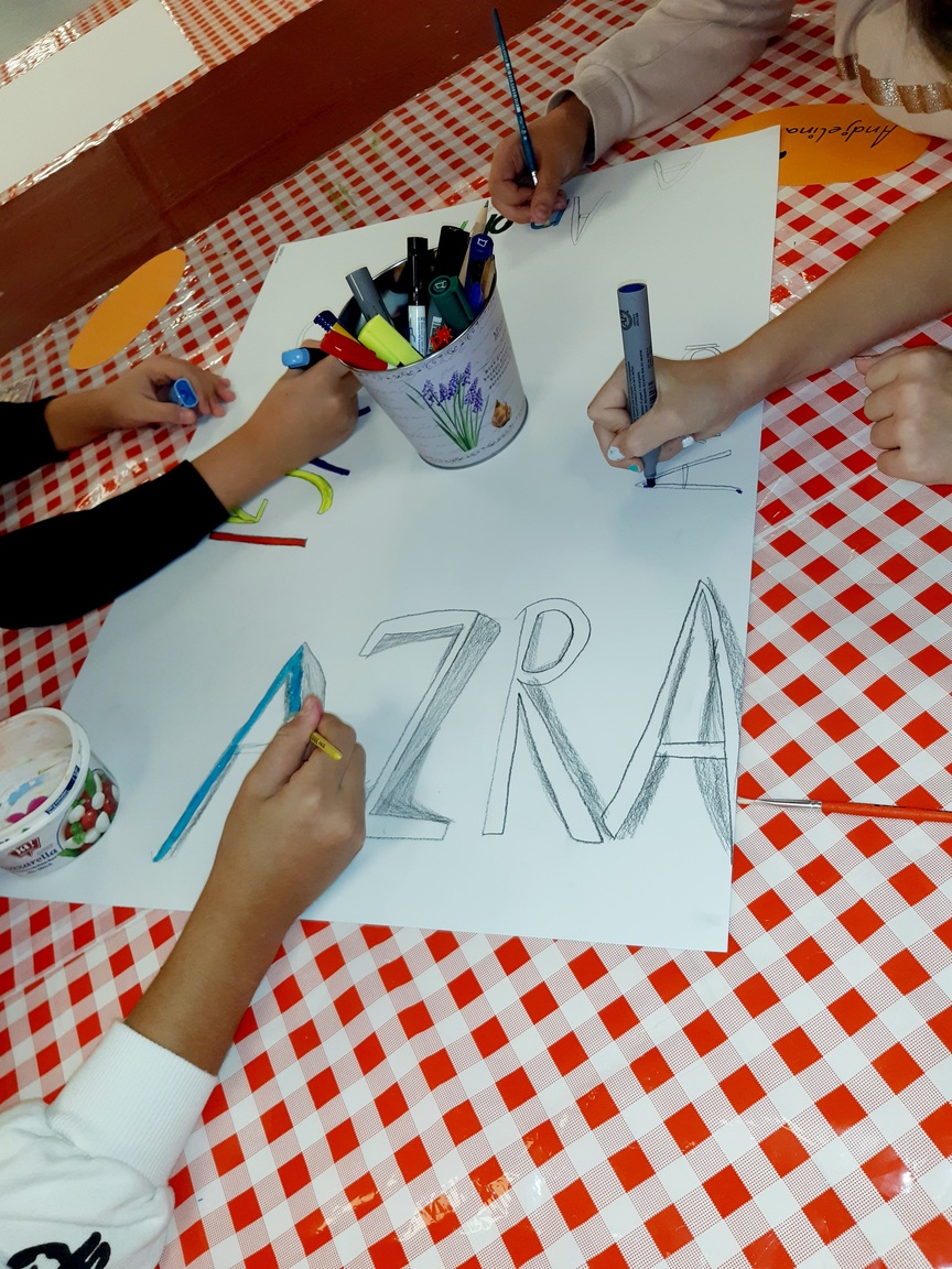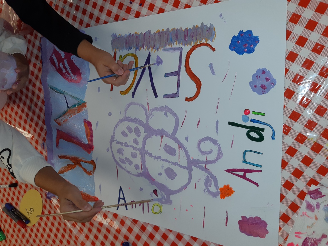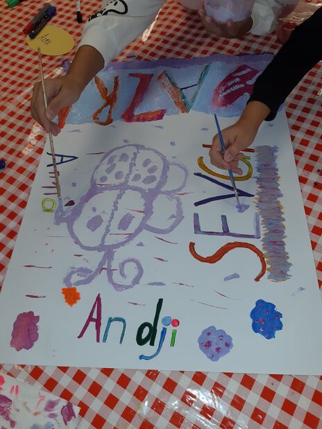 In drei Kleingruppen gestalteten Mädchen aus der Hanssonsiedlung Plakate mit ihren Namen und kreativen Motiven.