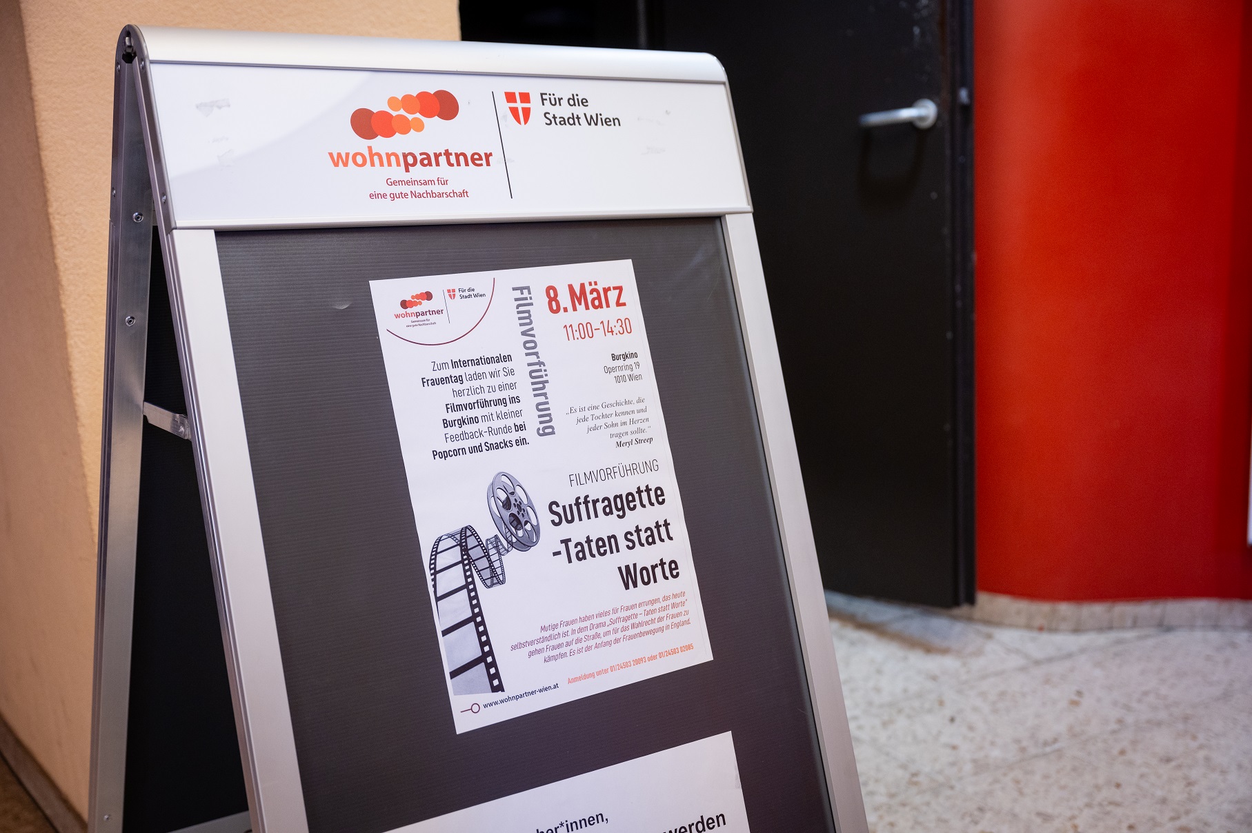 Für den Weltfrauentag organisierte wohnpartner im Burgkino die Vorführung des Films „Suffragette – Taten statt Worte“ - inkl. Popcorn und Getränken. Aus ganz Wien kamen rund 90 Frauen zusammen, um sich diesen spannenden und bewegenden Film über den Kampf für das Frauenwahlrecht in Großbritannien zu Beginn des 20. Jahrhunderts anzusehen.