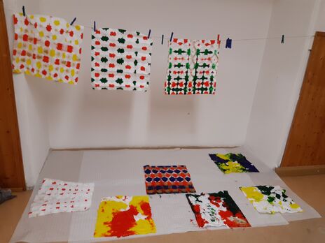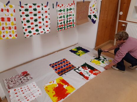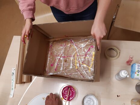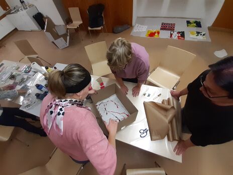 Der Auftakt für die Kreativwerkstatt im Grätzl-Zentrum Kaisermühlen machte der vorweihnachtliche Workshop „Geschenkpapier und Karten selber gestalten“. Es wurden unterschiedliche Techniken von japanischer Shibori Technik bis Farb-Murmelrollen ausprobiert.