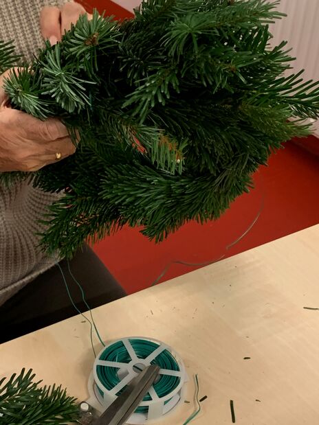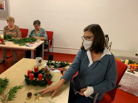 Die Bewohner*innen kamen bei Kaffee und Kuchen zusammen und banden in harmonischer Atmosphäre mit Weihnachtsmusik ihren Adventkranz, kamen zum Plaudern.