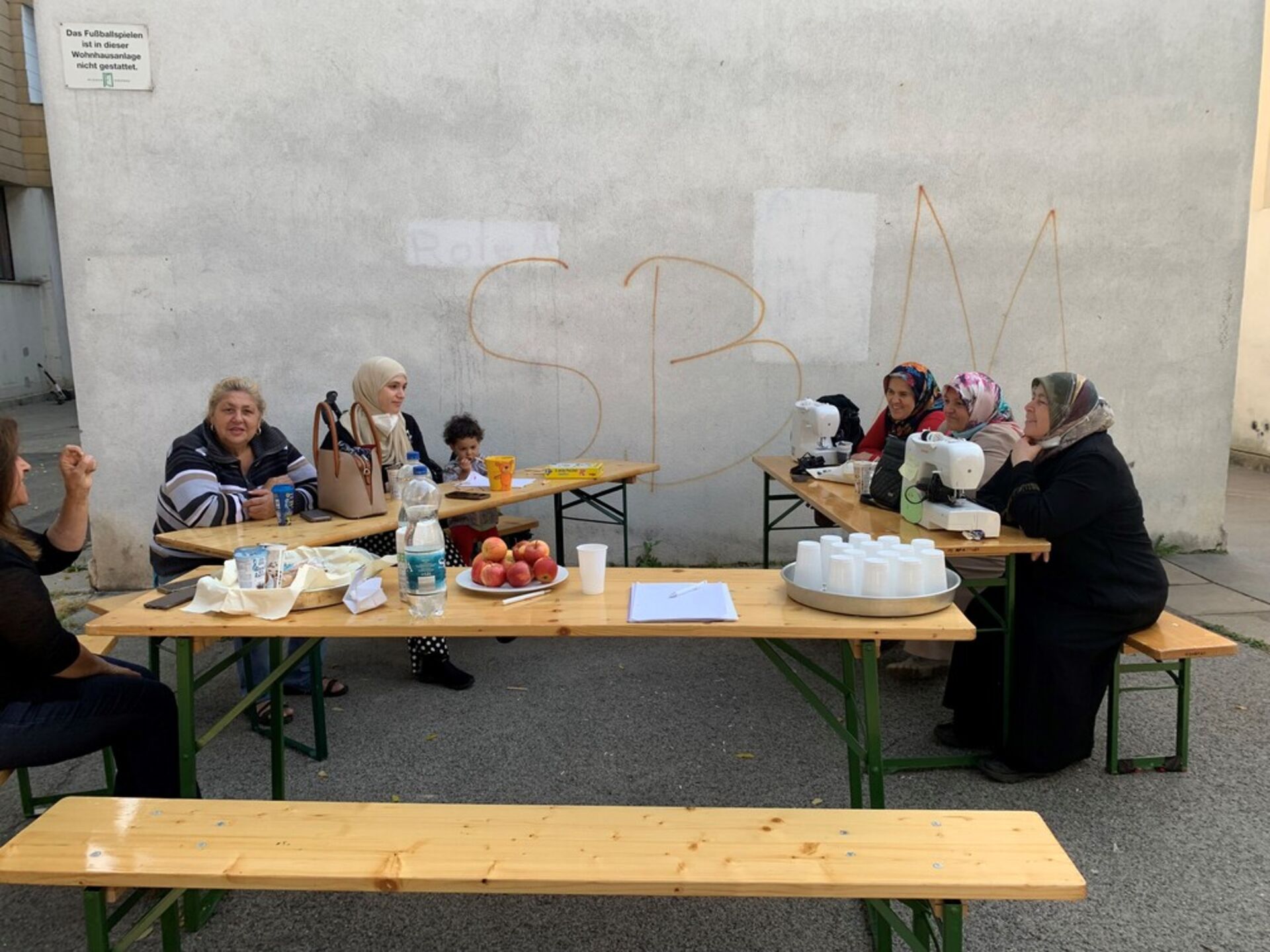 Am 14. September 2021, vormittags fand vor dem BewohnerInnen-Zentrum Karl Wrba Hof gemeinsam die „Näh- und Kreativwerkstatt“ und „Frauen Café“ statt und waren bestens besucht. In einer netten Atmosphäre haben sich Bewohnerinnen zusammengefunden, sich ausgetauscht und geplaudert. Ideen und Bedürfnisse der Teilnehmerinnen wurden für die nächsten Aktionen gesammelt. Bei jedem Dienstagvormittag können die Teilnehmerinnen selber entscheiden, ob sie Nähen, Basteln sich Kreativ tätigen oder einfach beim Café trinken austauschen wollen.