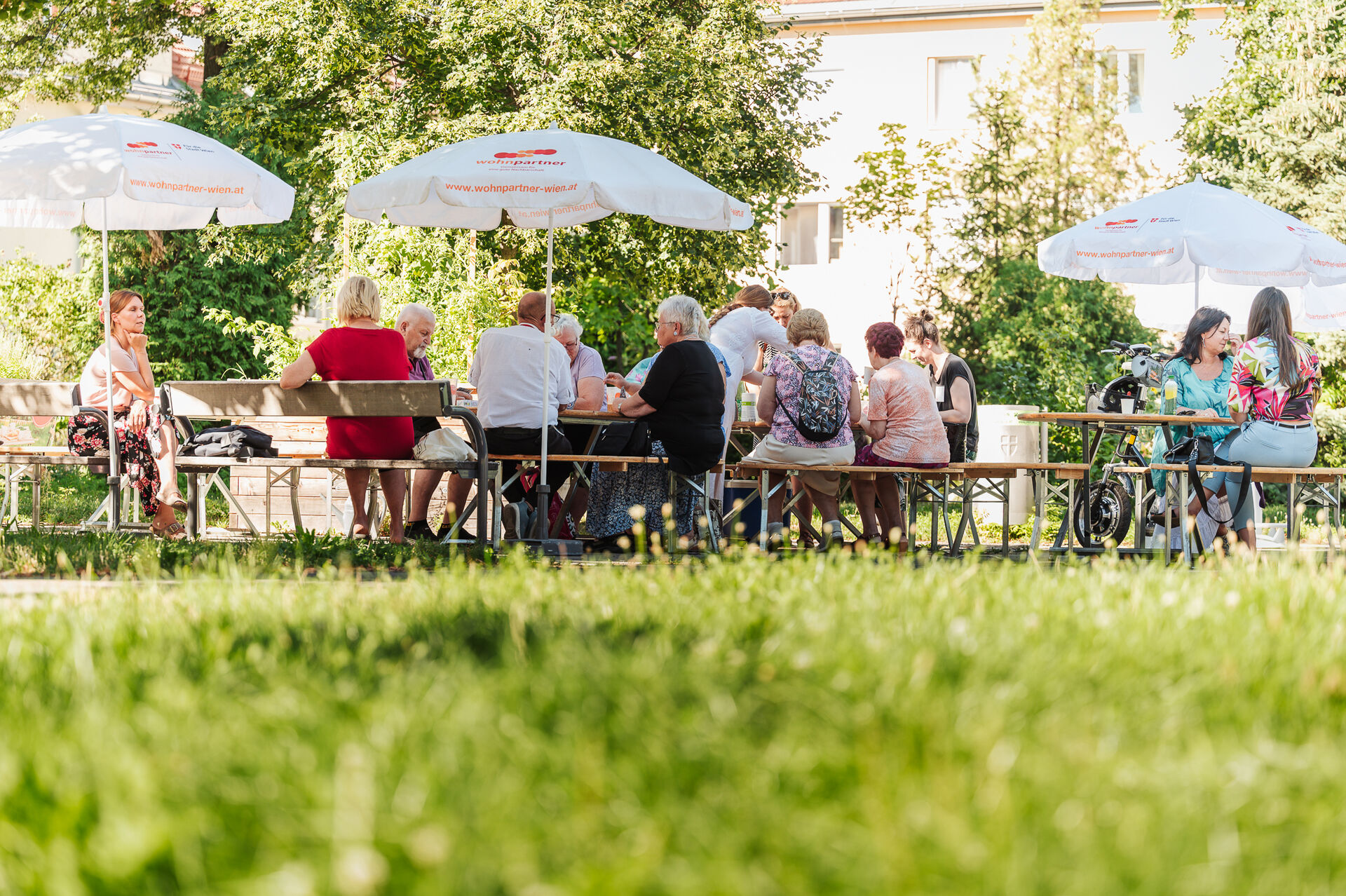 wohnpartner lädt zu einem entspannten Sommerabend im Karl-Waldbrunner-Hof mit erfrischenden Getränken, Snacks und Obst. Alle Bewohner*innen sind herzlich eingeladen.