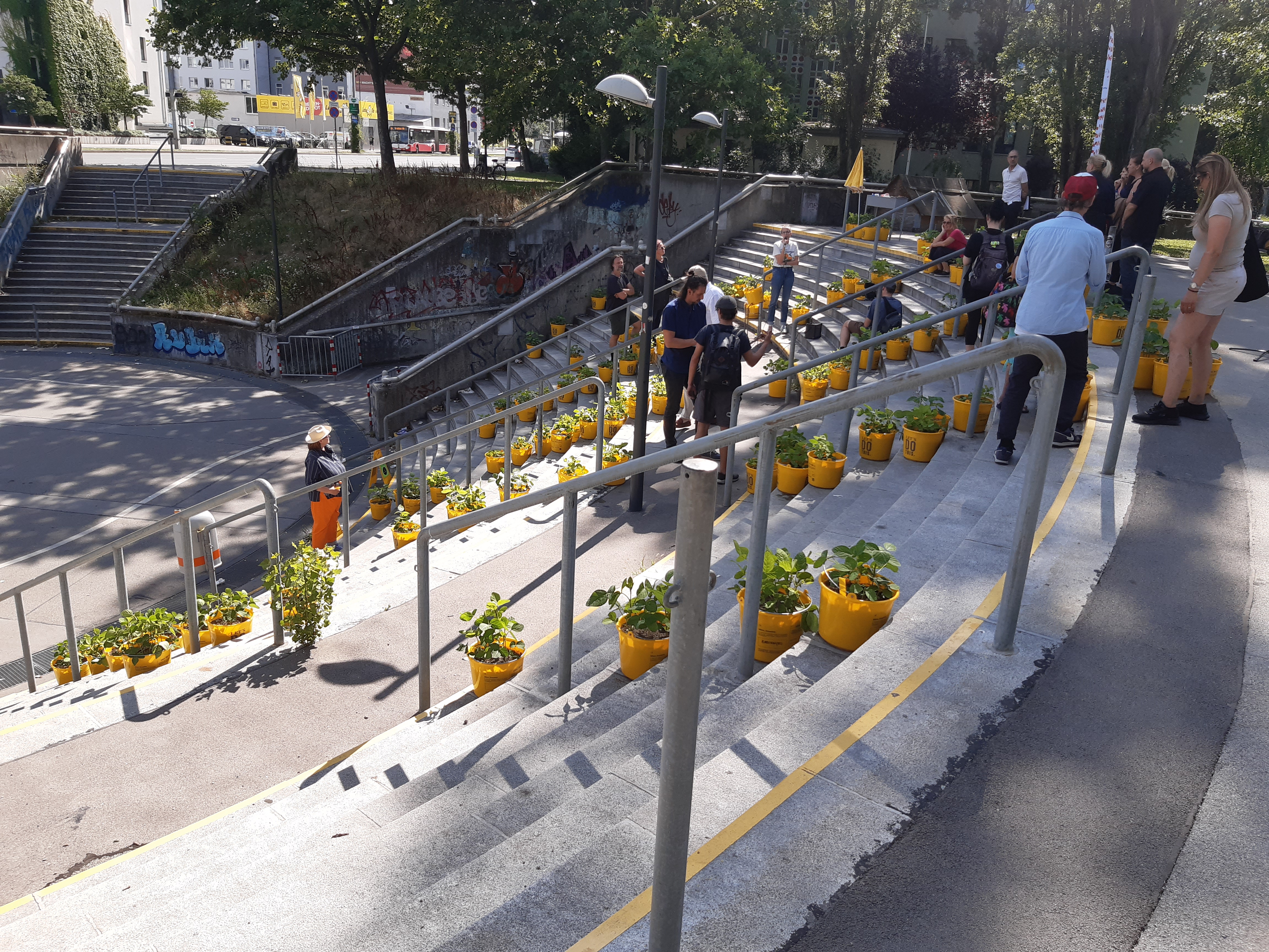 Die Sojapflanzen-Verteilaktion am 24.Juni 2024 in der Friedrich-Engels-Platz/Fußgänger Unterführung war ein großer Erfolg. Das Interesse der Bewohner*innen an der Aktion war groß. Viele Sojaplatzen konnten ein neues zu Hause in dem Gemeindebauten des 20. Bezirks finden. Mit dem QR-Code auf den Kübeln erfährt man mehr über das Projekt und wird rechtzeitig über weitere Veranstaltungen informiert.