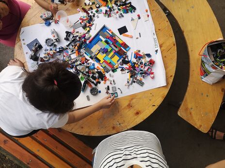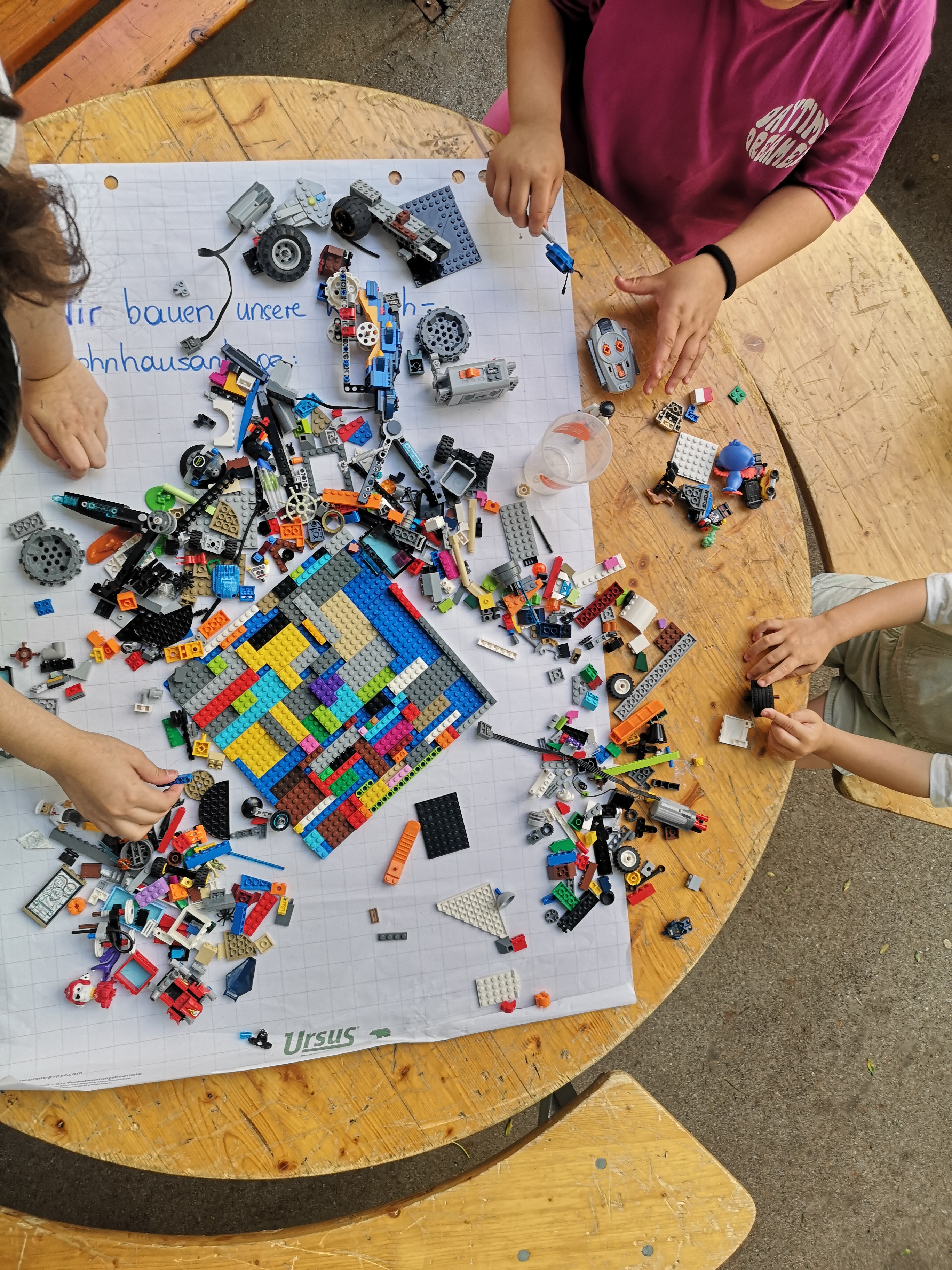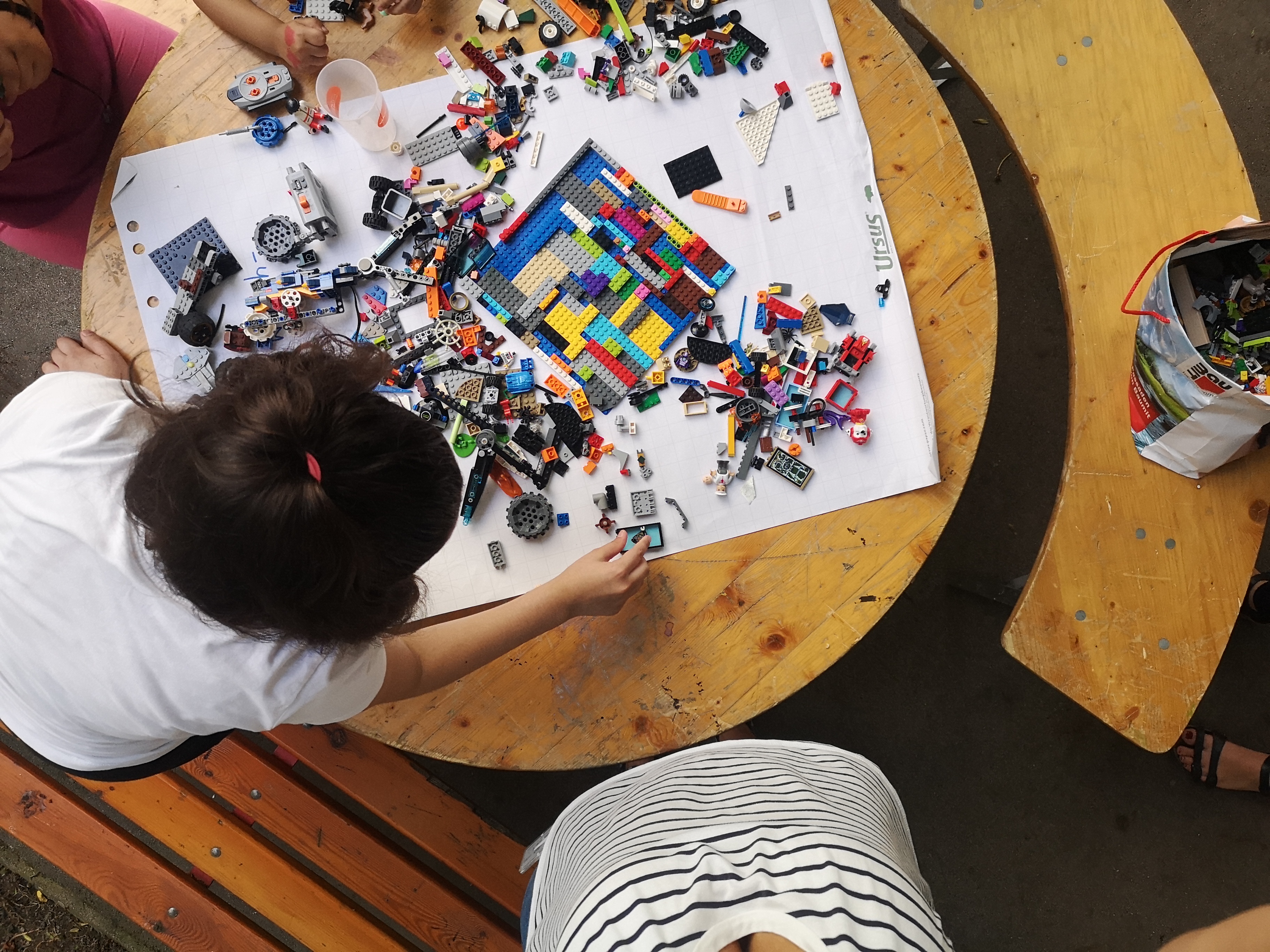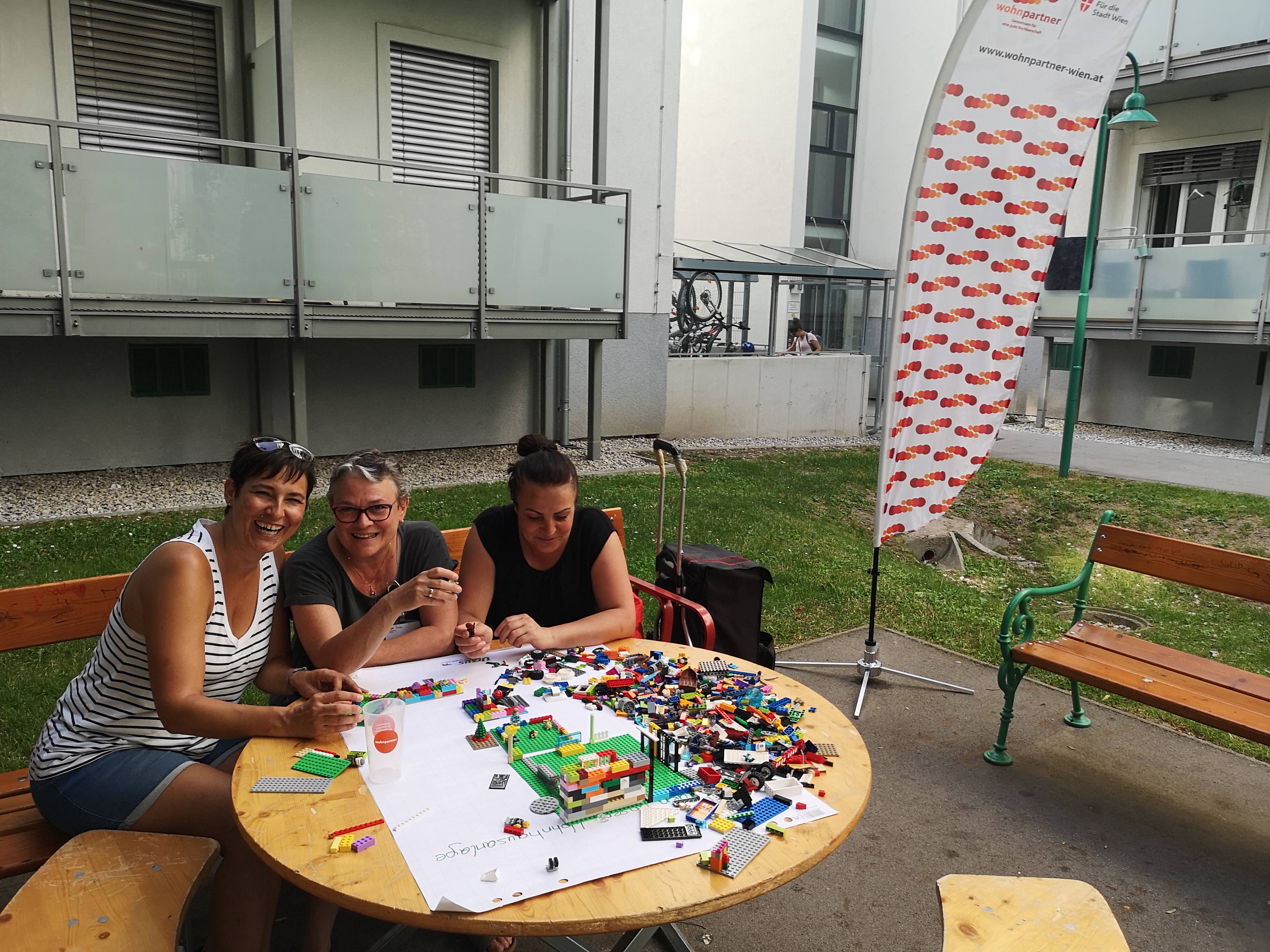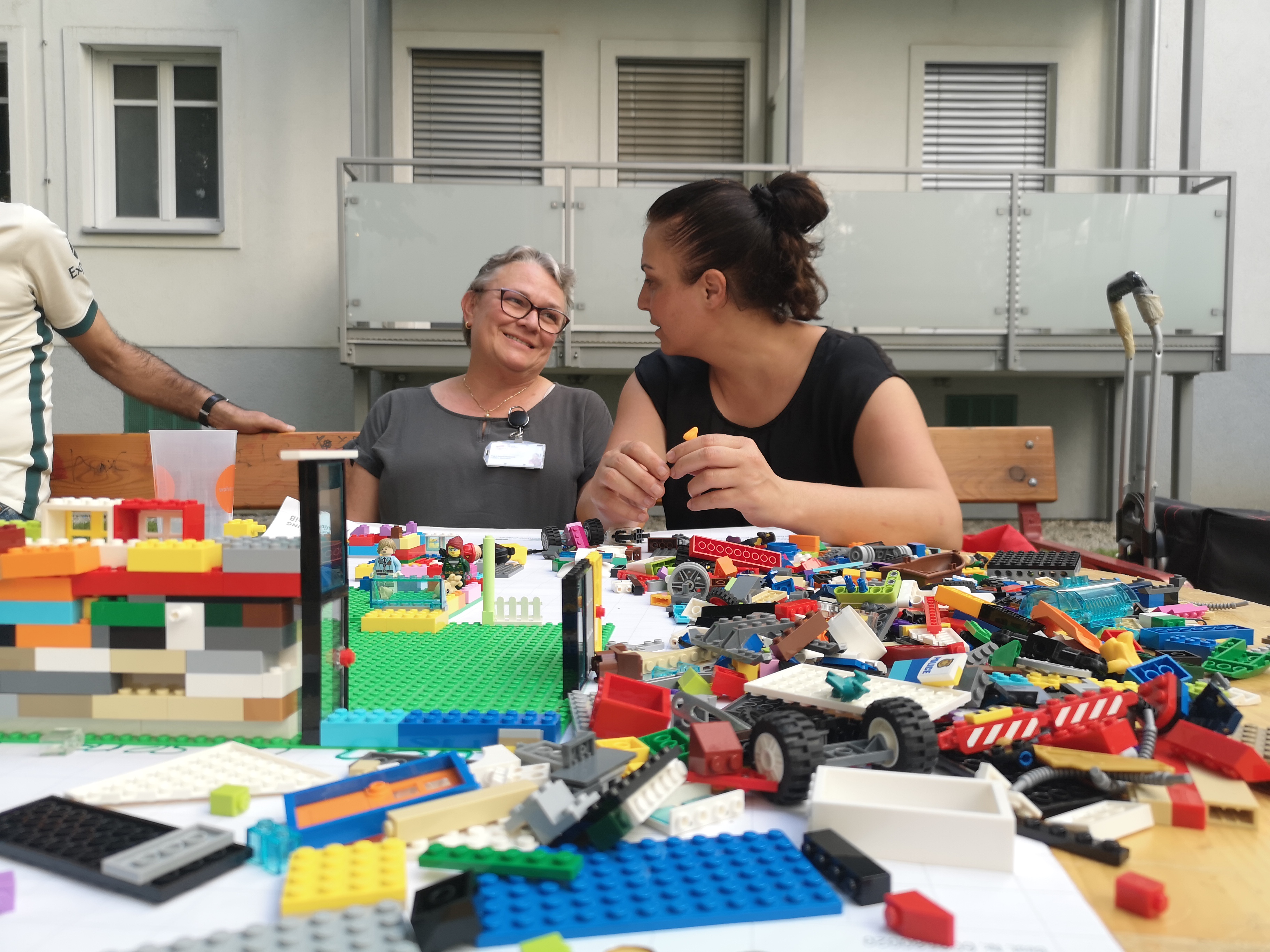 Vorwiegend Kinder nutzten die Gelegenheit und widmeten sich mit Lego-Steinen unterschiedlichen Aufgabenstellungen rund um das Thema Mediation und Konfliktvermittlung. Zunächst wurden eine realistische Sicht und eine Wunschvorstellung der Gebäude aufgebaut. In einem weiteren Schritt präsentierten sich die Teilnehmer*innen ihre Bauwerke gegenseitig und sprachen über ihre Ideen für das Miteinander und die gemeinsame Nutzung des Hofes.