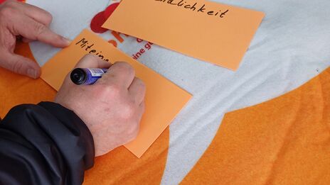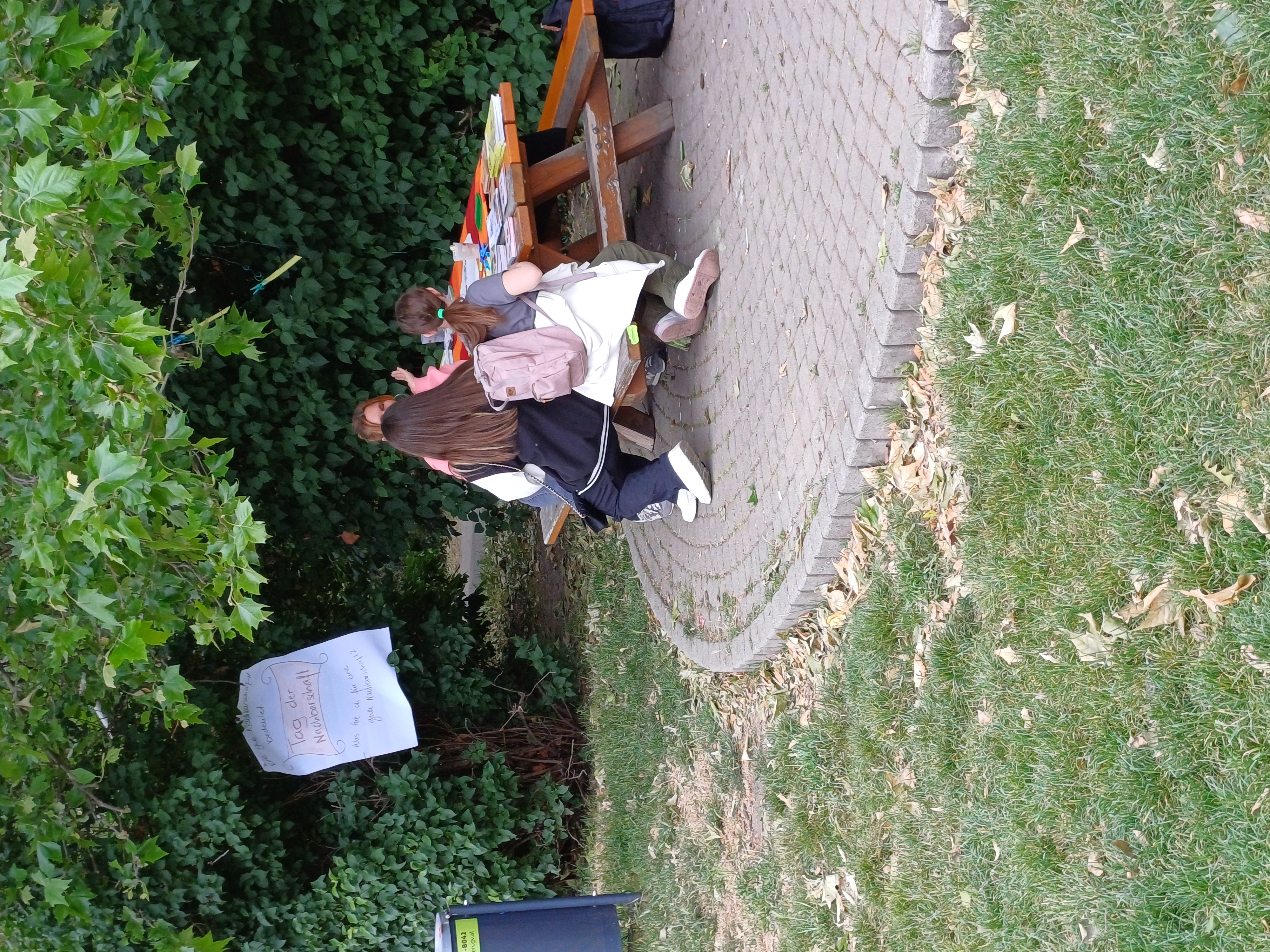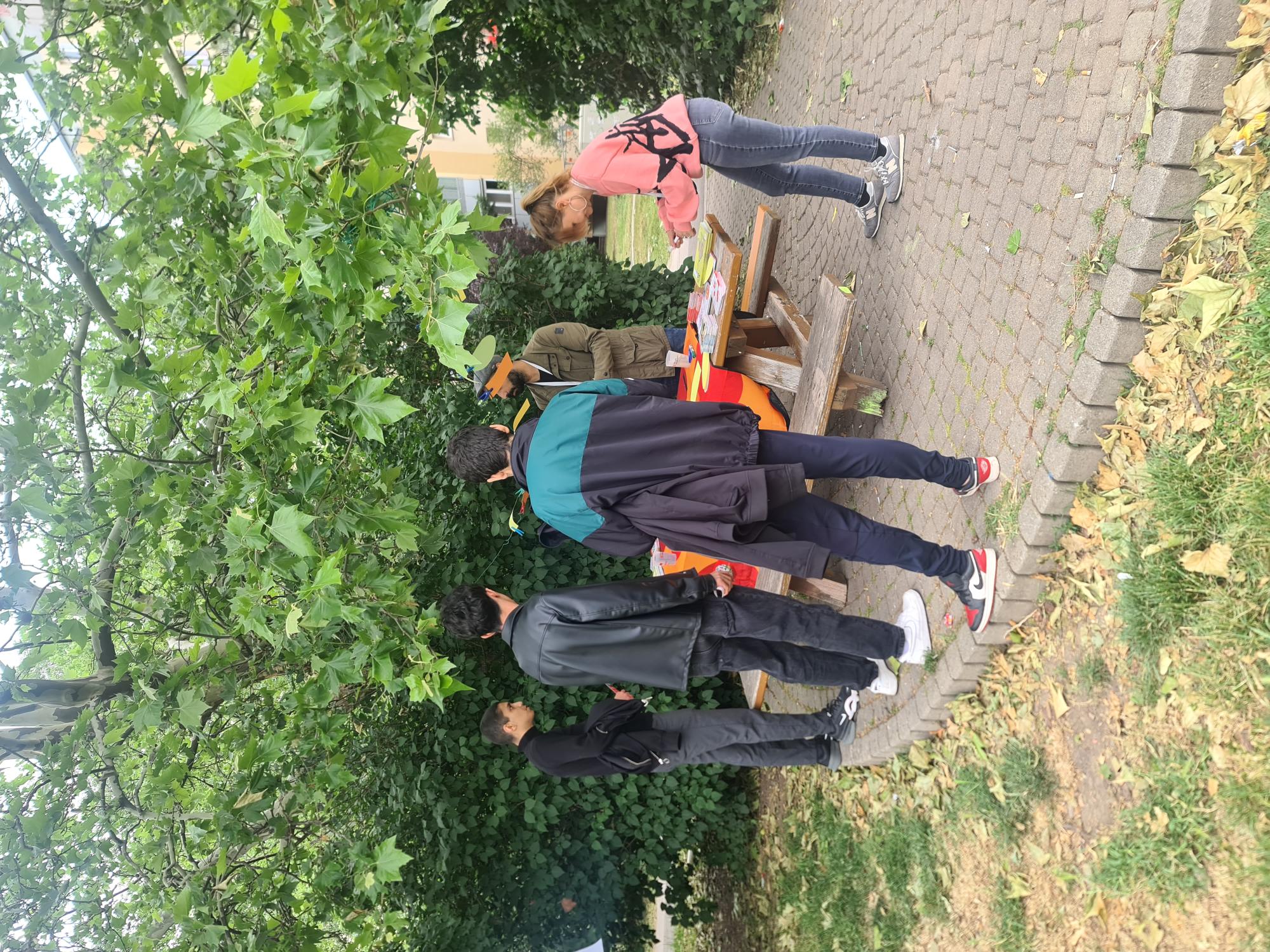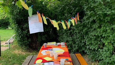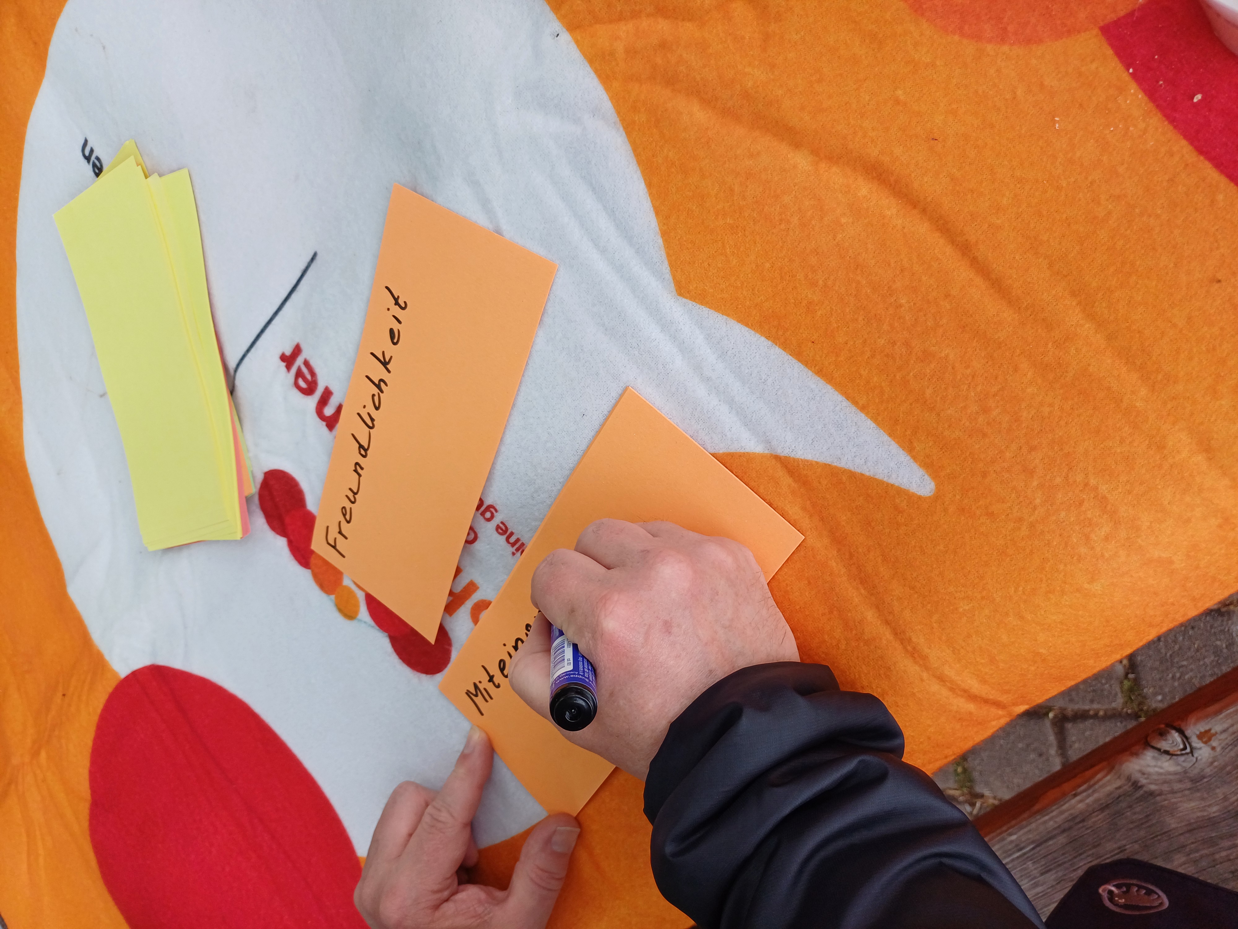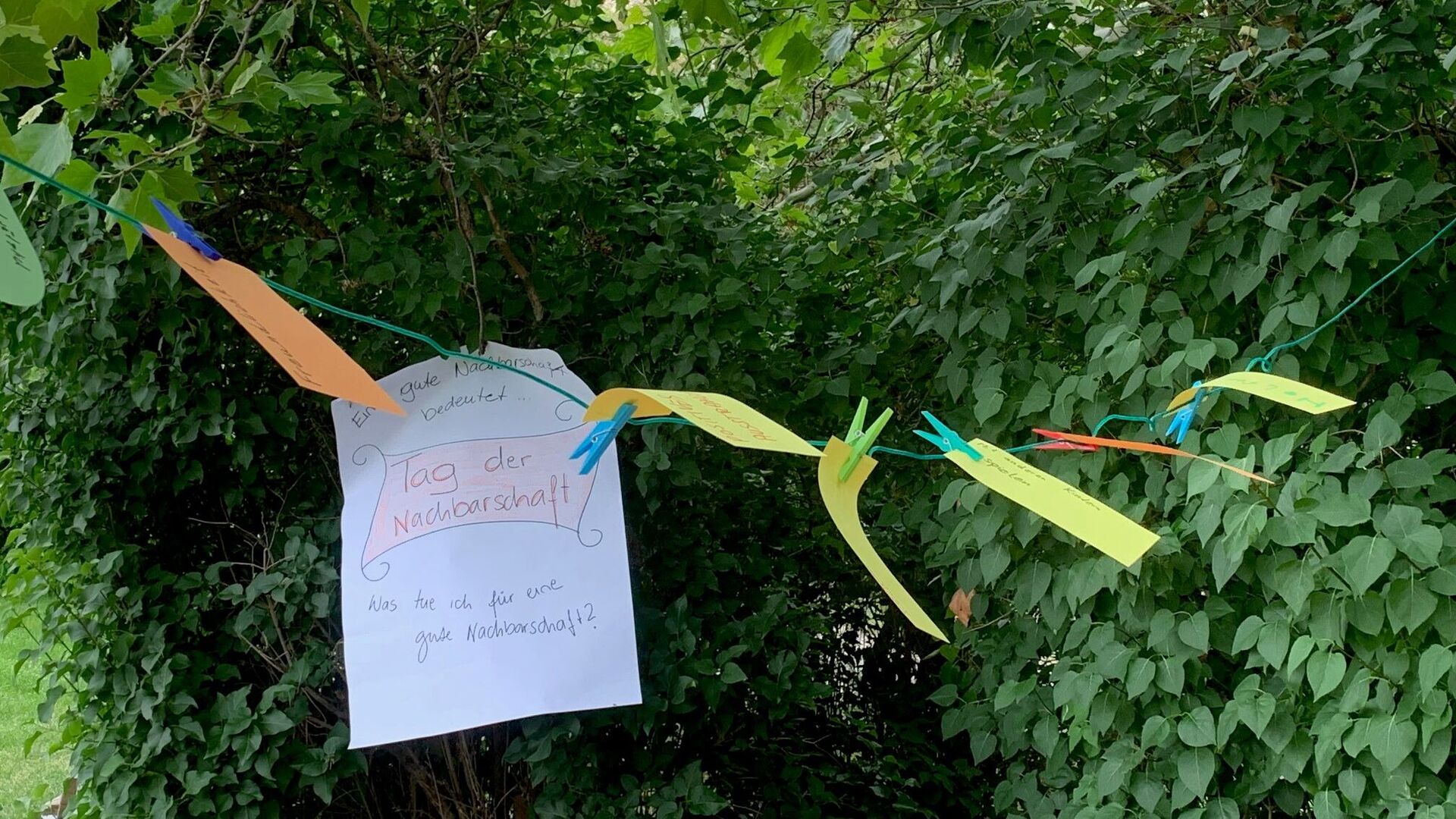 Bei gemütlicher Atmosphäre wurden Bewohner*innen und Anrainer*innen dazu eingeladen, ihre Ideen zu einer guten Nachbarschaft und was sie persönlich dazu beitragen können auf leere Moderationskarten zu schreiben. Die beschrifteten Blätter wurden an eine in der Parkanlage gespannte Wäscheleine geheftet.