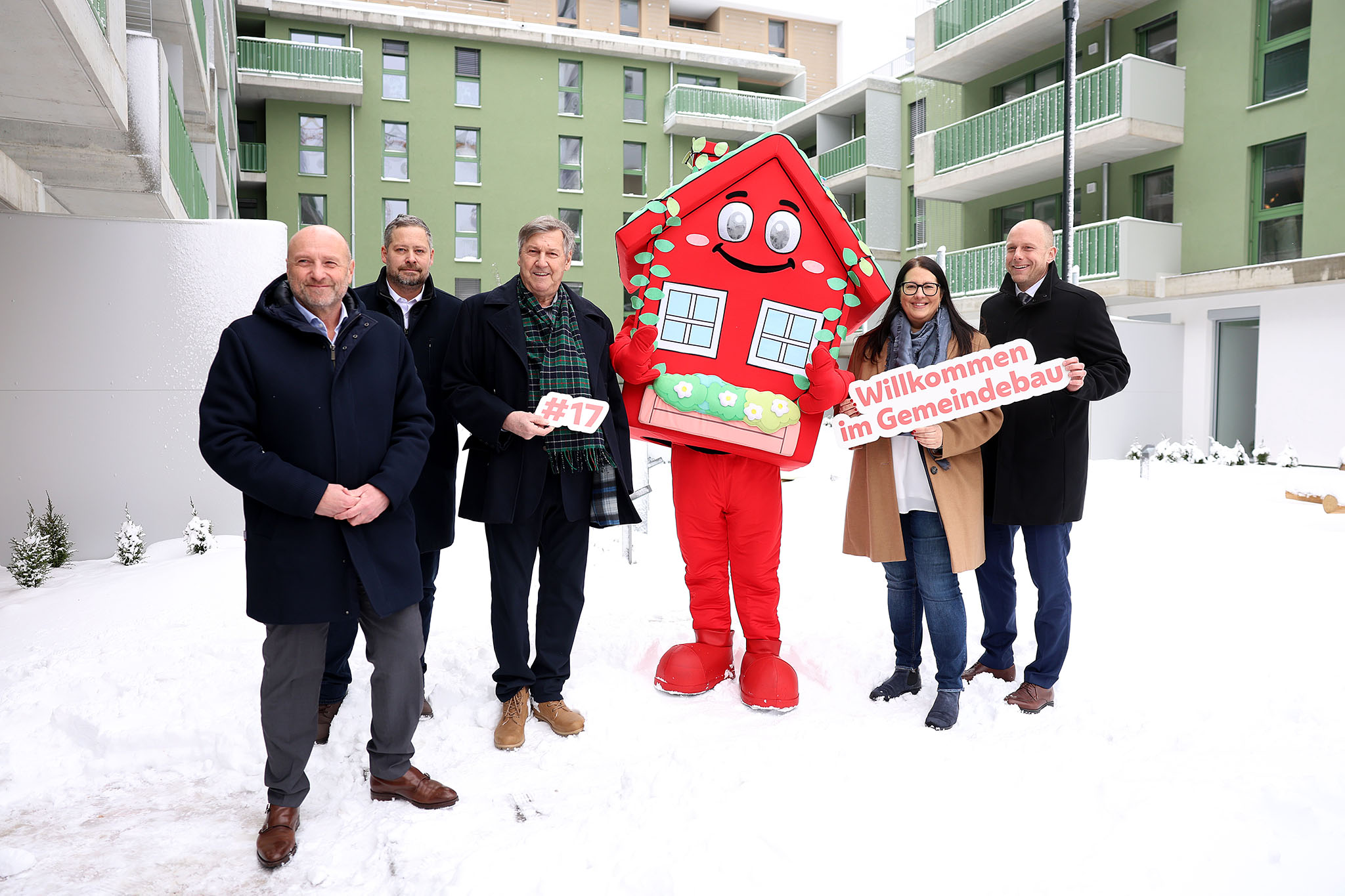 (v.l.n.r.) Paul Steurer (Direktor WIGEBA),Philipp Wachter (Vize-Direktor Wiener Wohnen), Erich Hohenberger (Bezirksvorsteher Landstraße), Kathrin Gaál (Vizebürgermeisterin und Wohnbaustadträtin) und Roland Böhm (Direktor WIGEBA).