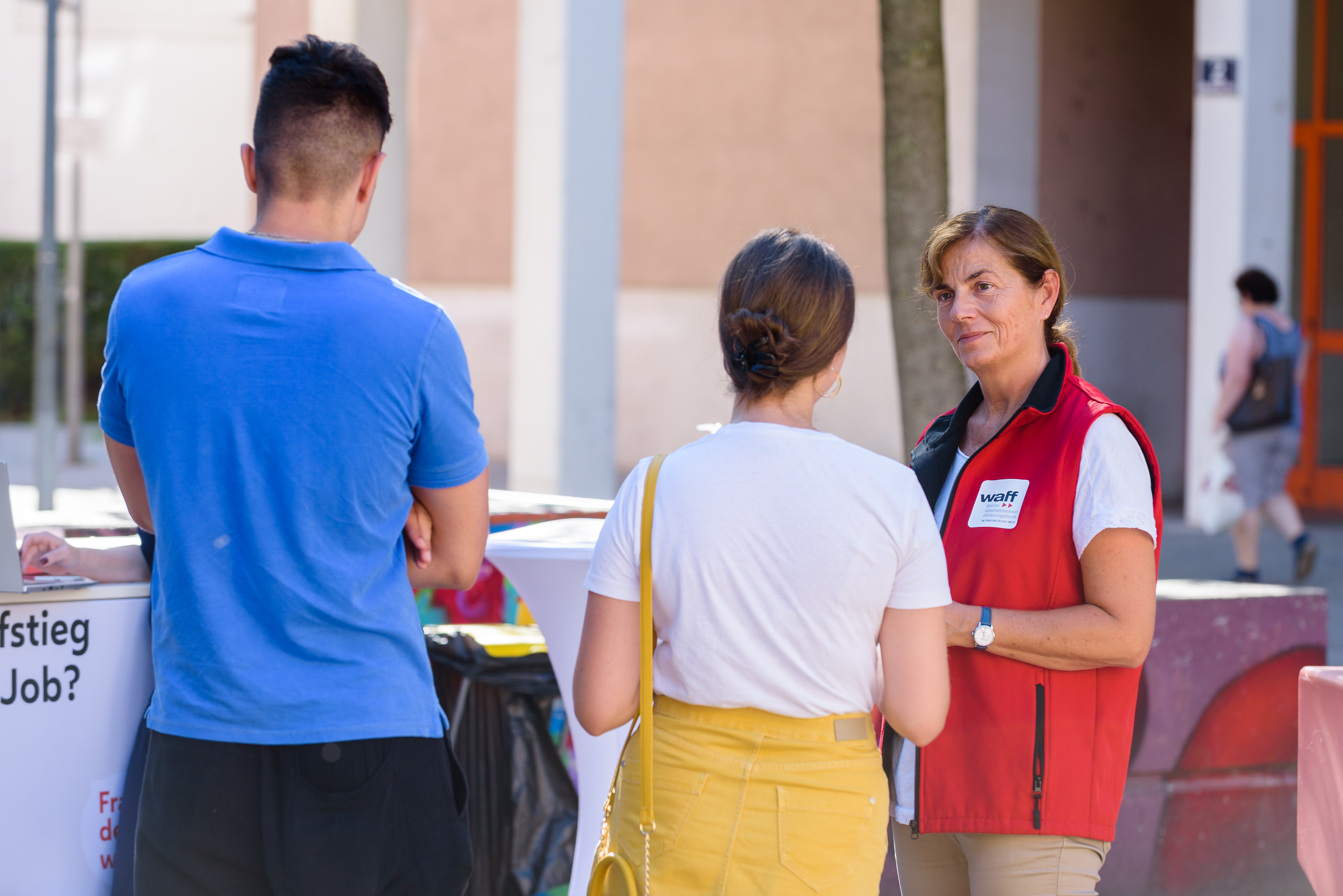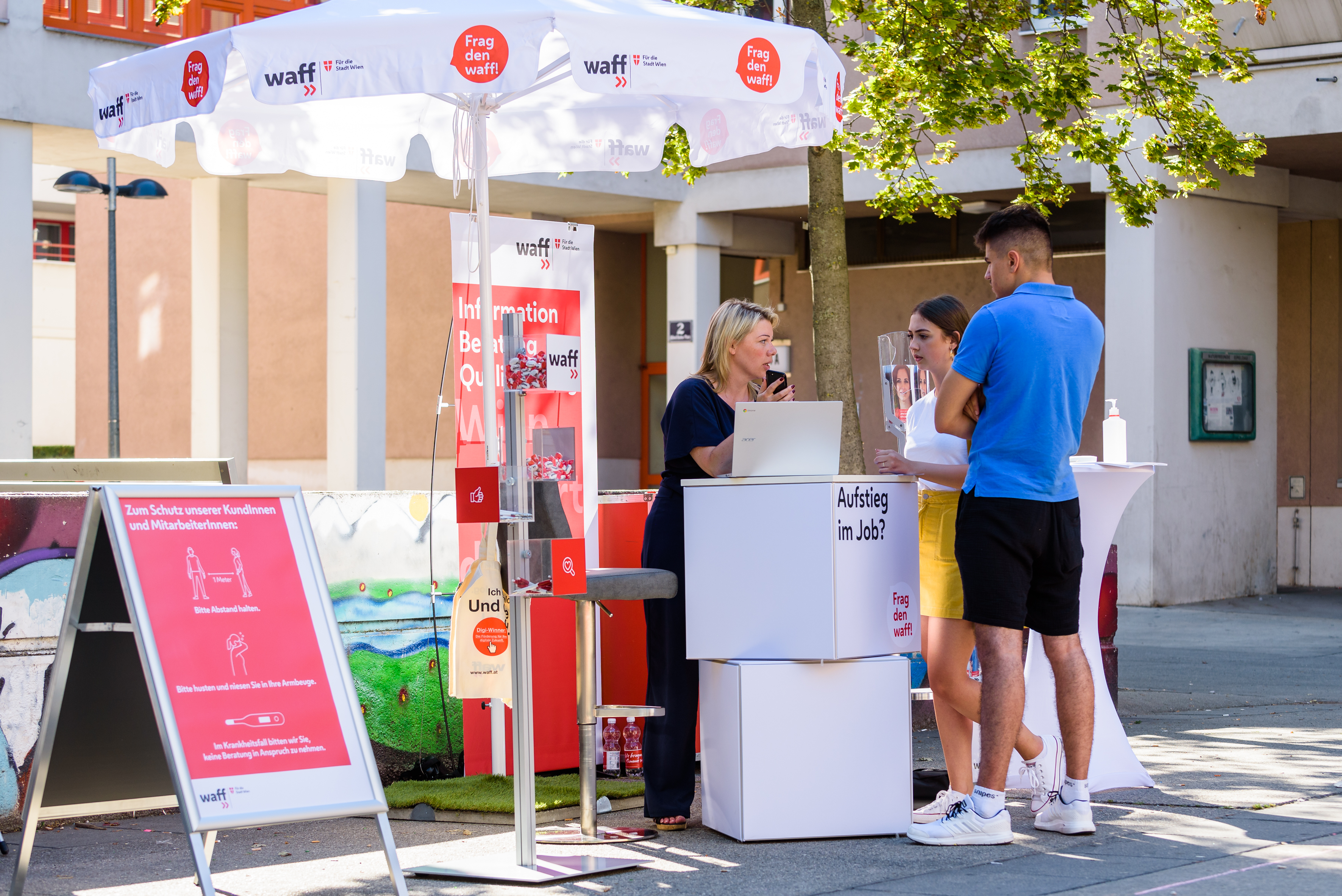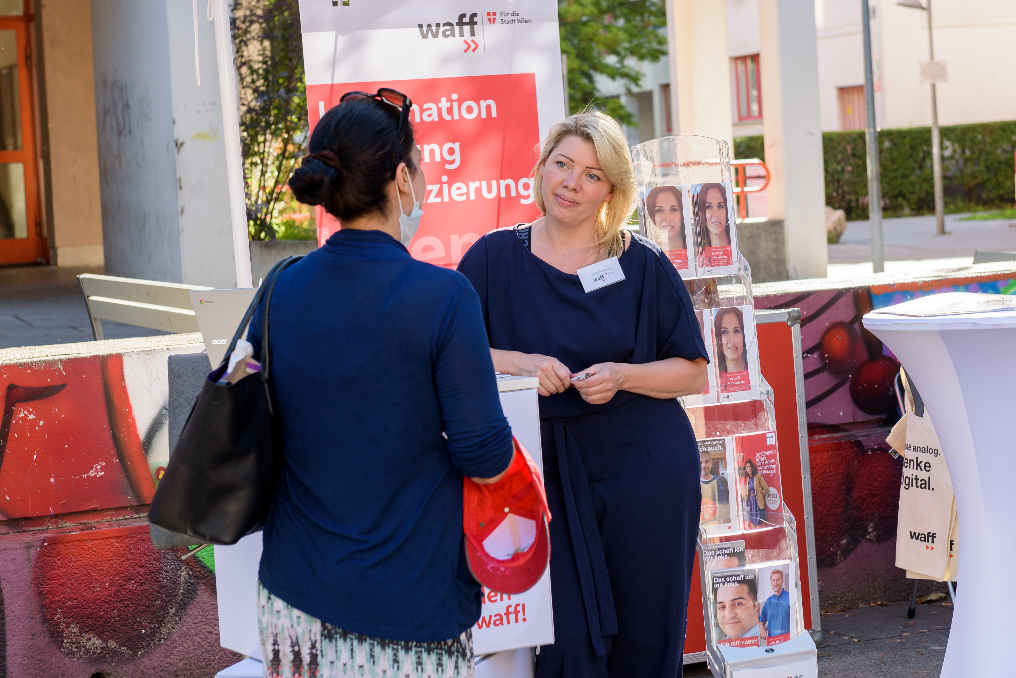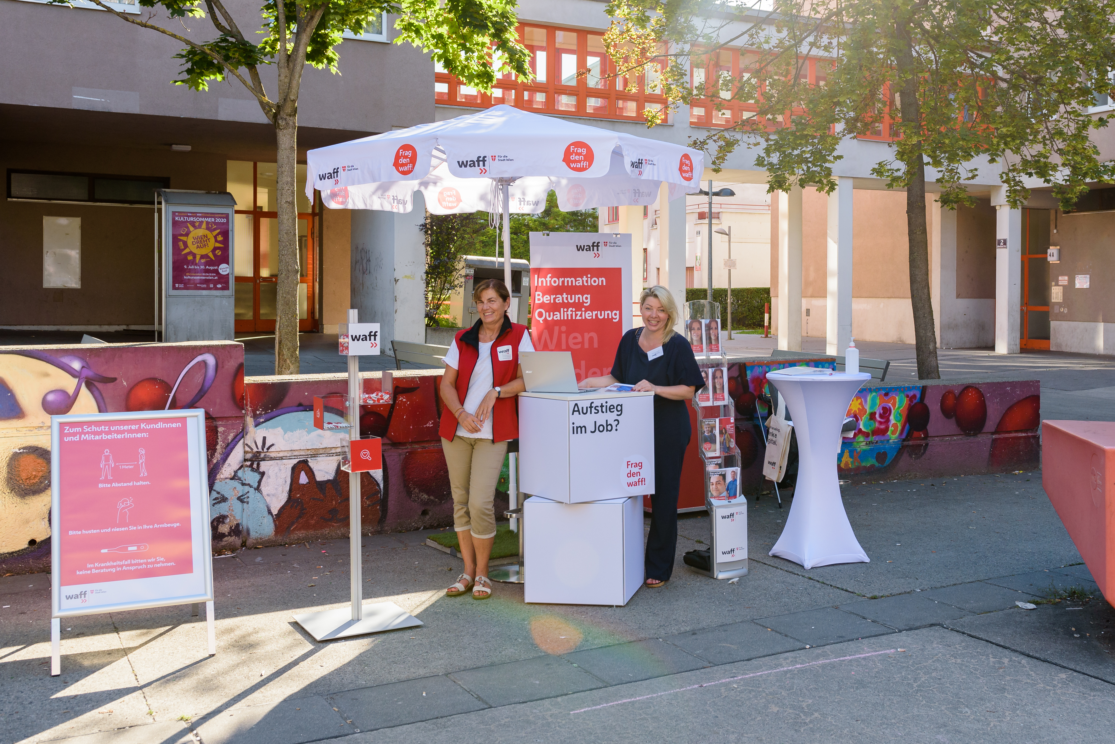 Am 30.7.2020 fand am Alfred-Kubin-Platz, 1220 Wien, ein Informationsnachmittag mit 2 Infoständen von wohnpartner und waff (Beratung zu Aus- und Weiterbildung) statt.