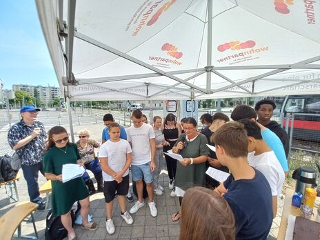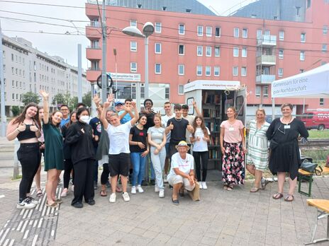 Die Leseklasse der Bruno-Kreisky-Schule und Herr Steinböck, ein engagierter Dichter, haben der Bücherkabine zu diesem Anlass aus Ihren Werken vorgelesen. Im Anschluss wurde der Bücherkabine ein Ständchen gesungen. Die Geburtstagstorte hat allen geschmeckt und Getränke haben für Abkühlung gesorgt!