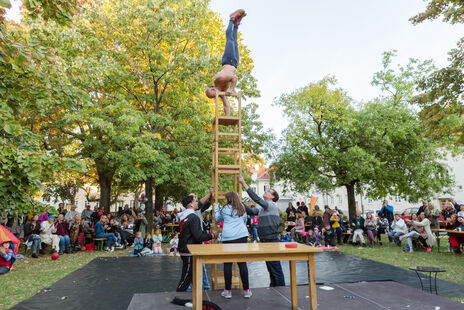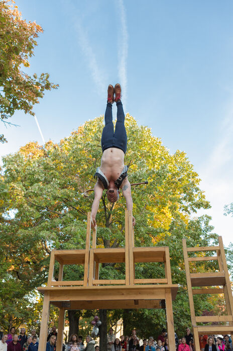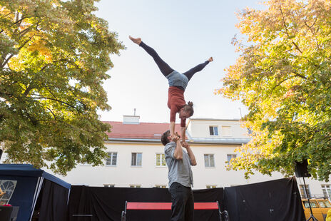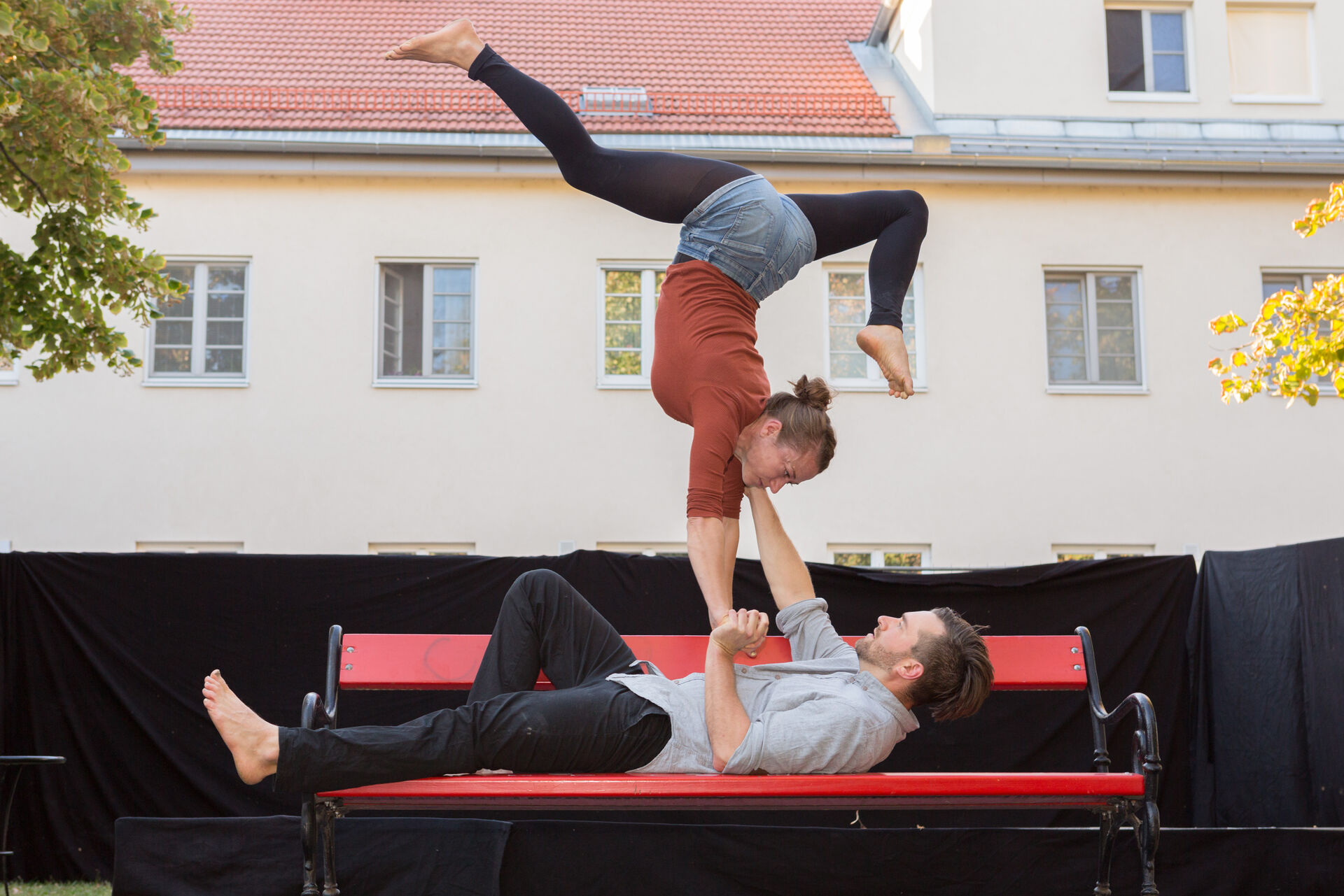 Von 17.00 bis 19.00 Uhr unterhielt eine Zirkusshow, die von der charmanten Gaffa Galaktika moderiert wurde. Auf humorvolle und atemberaubende Art und Weise zeigten die Artist*innen Maja und Nina, Duo Septuplet, Anna Biebl und Fausto Tenorio, welche Bedeutung der Handstand im zeitgenössischen Zirkus spielt.