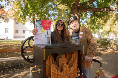14 Schautafeln am Albin-Hirsch-Platz und im Carsony-Park informierten über das spannende Leben der drei Brüder und luden die Besucher*innen ein, selbst aktiv zu werden. Die Jongleuse Ariane Öchsner und die Clownin Susanne Siebel boten um 14.00 und 15.00 Uhr eine szenische Führung an.