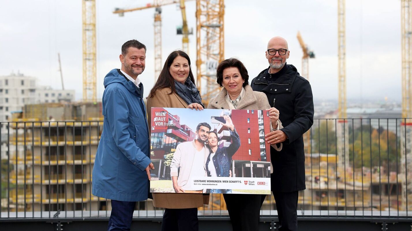 (v.l.n.r.) Gregor Puscher (GF wohnfonds_Wien), Vizebürgermeisterin & Wohnbaustadträtin Kathrin Gaàl, Margarete Kriz-Zwittkovits (Vizepräsidentin WKW) und Josef Cser (GF Wohnservice Wien)